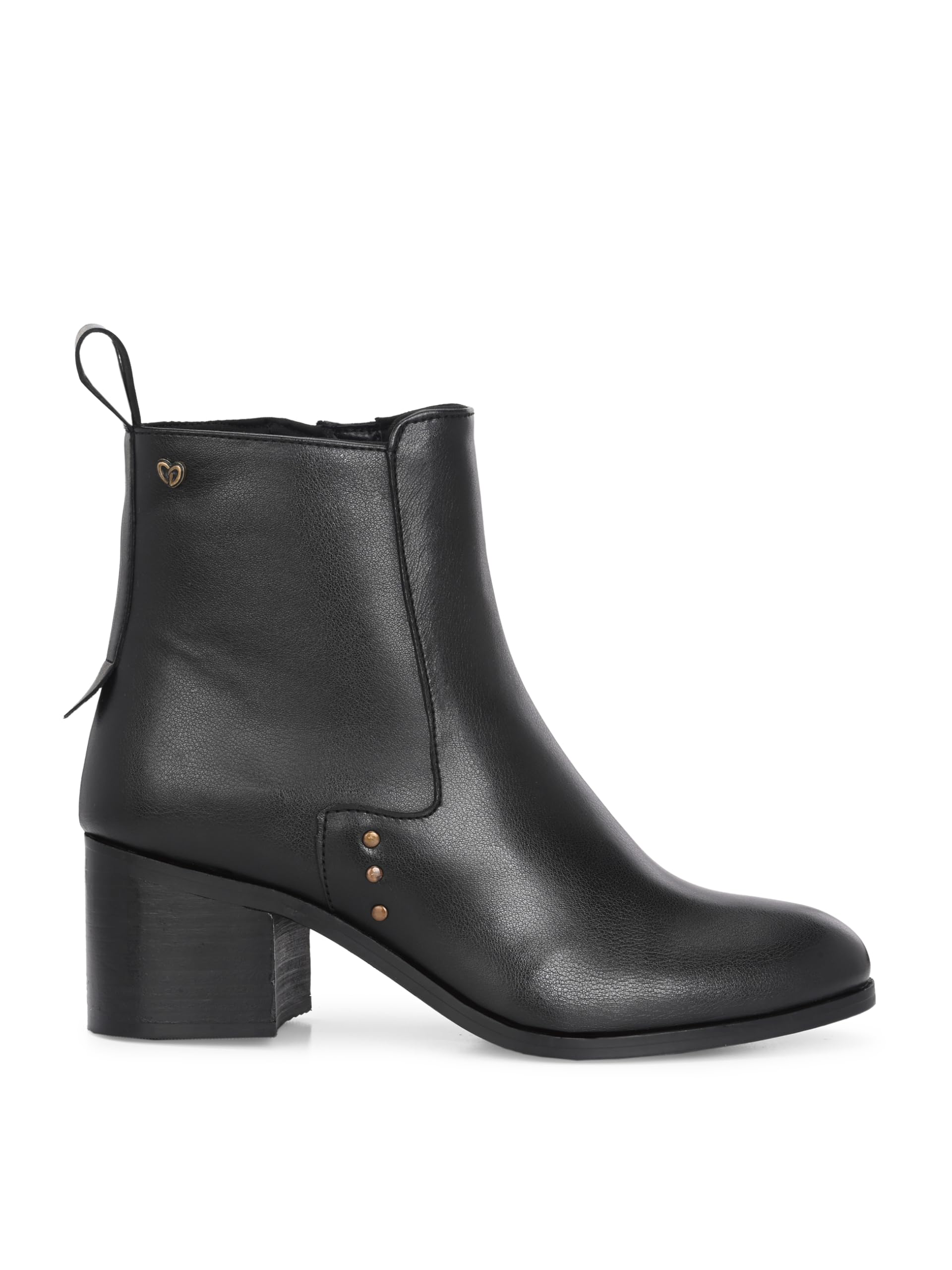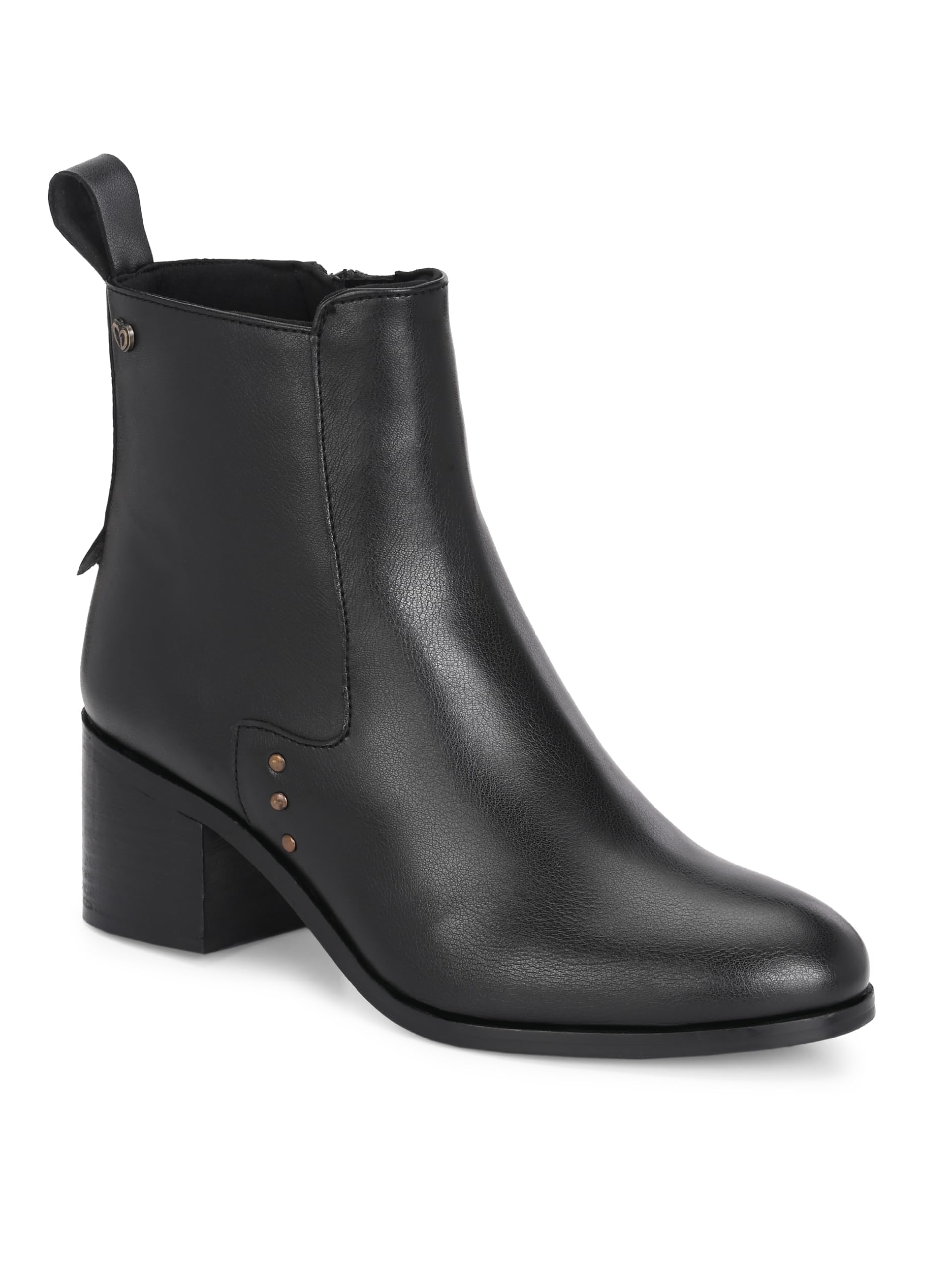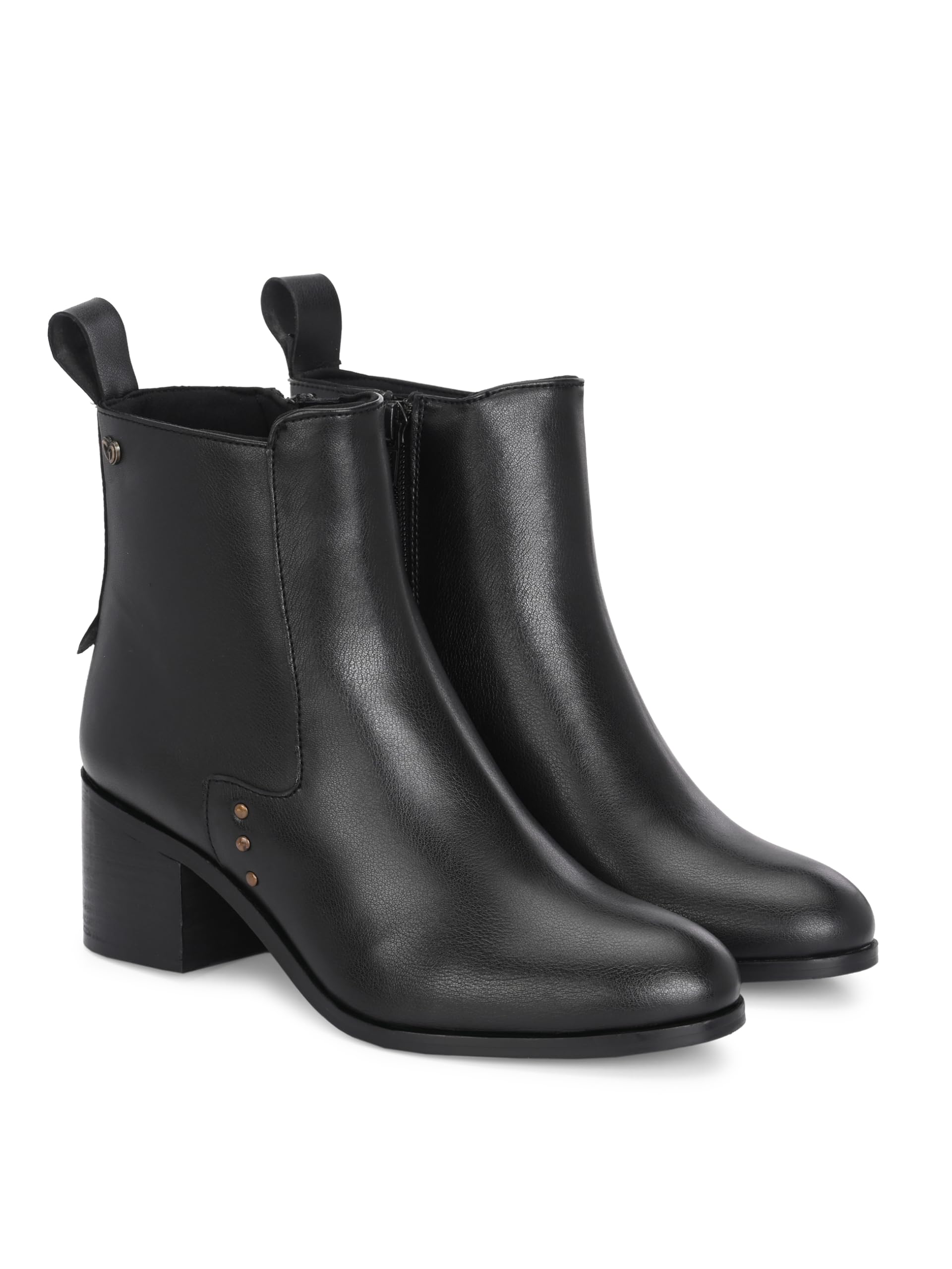 Tan women vegan leather, mid heel ankles boots with handmade outsole n inside zip to wear easily. Has back loop n rivet detail. Fabric lining and memory foam insock for ultimate comfort.Heel height - 2.36 inches