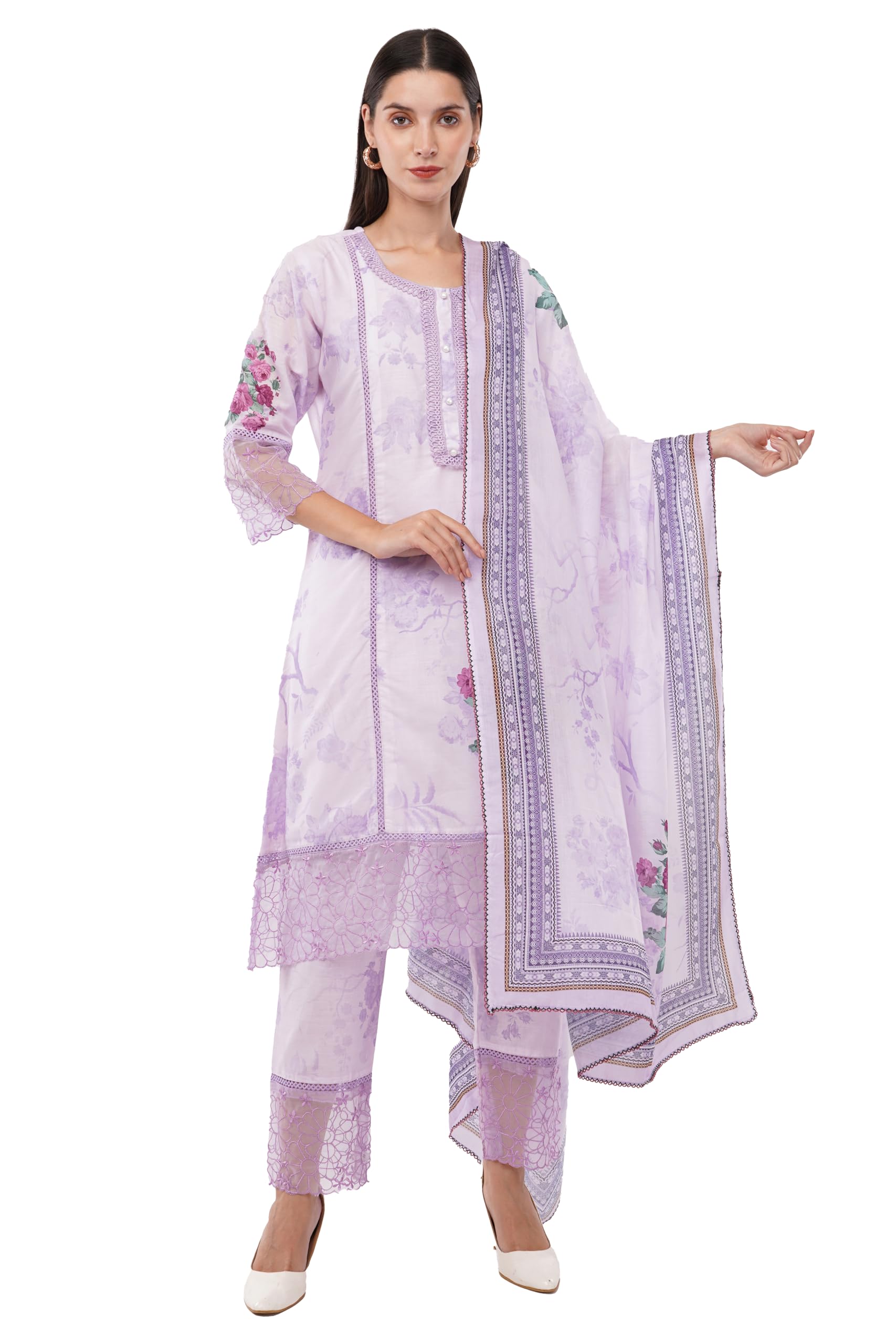 - Breezy Style: Featuring a floral printed stylish sheer detailing on 3/4 quarter sleeves and borders in a rich Lavender shade, this woman's kurti set combines traditional elements with contemporary style, creating a versatile design that’s perfect for any occasion.