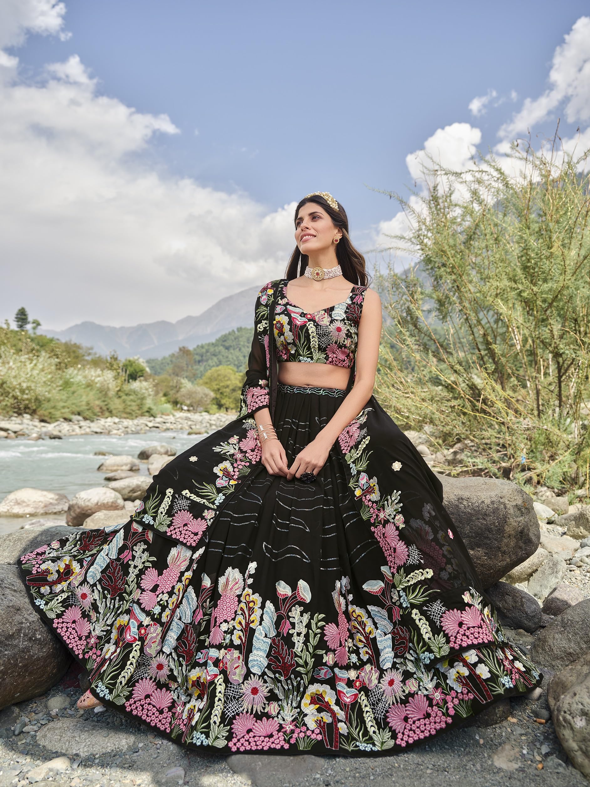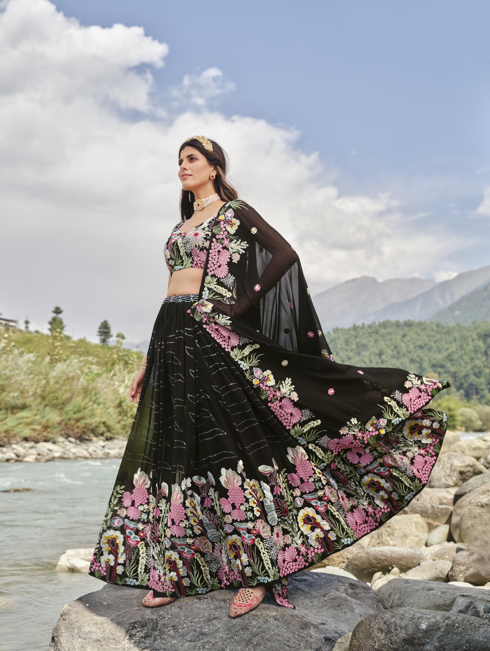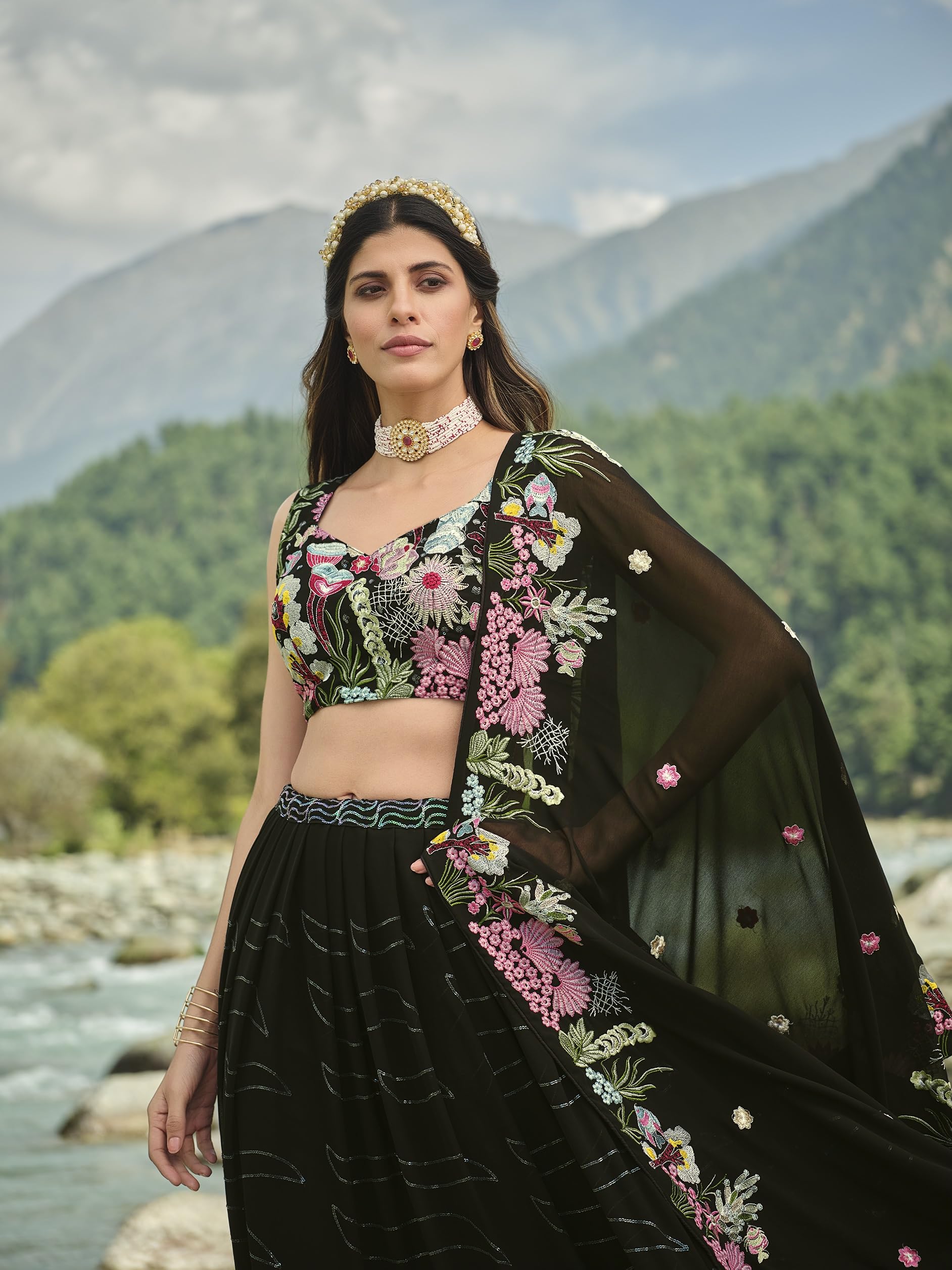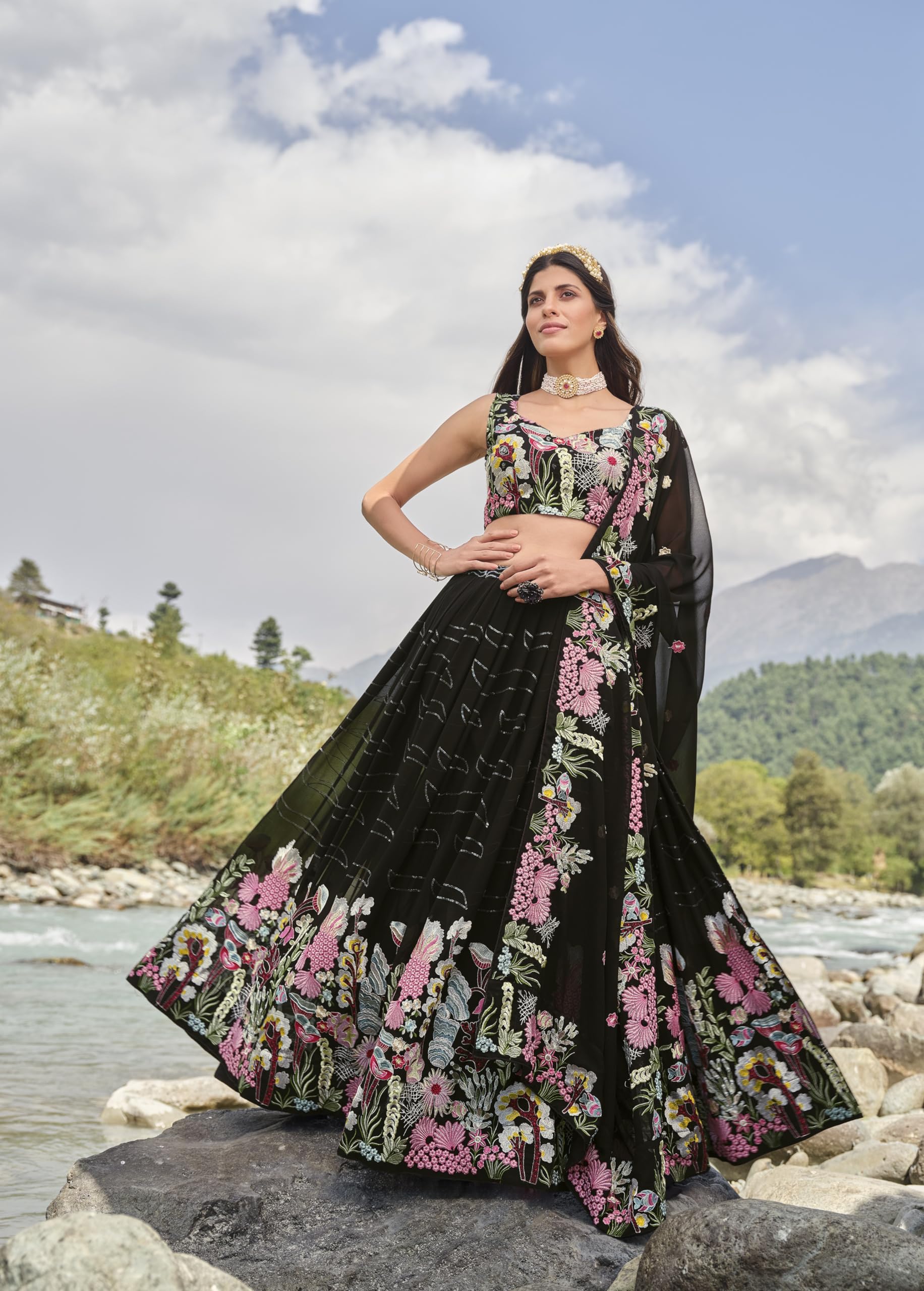 Divine Exim Women's Georgette Semi Stitched Lehenga Choli with Dupatta | Thread and Sequin Embroidery Pattern | Traditional, Wedding, Ethnic Wear Lehenga