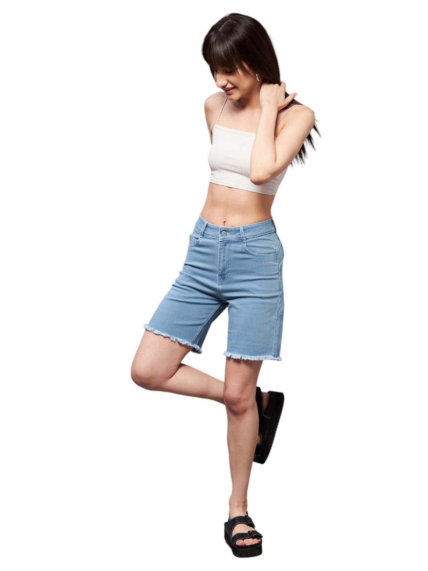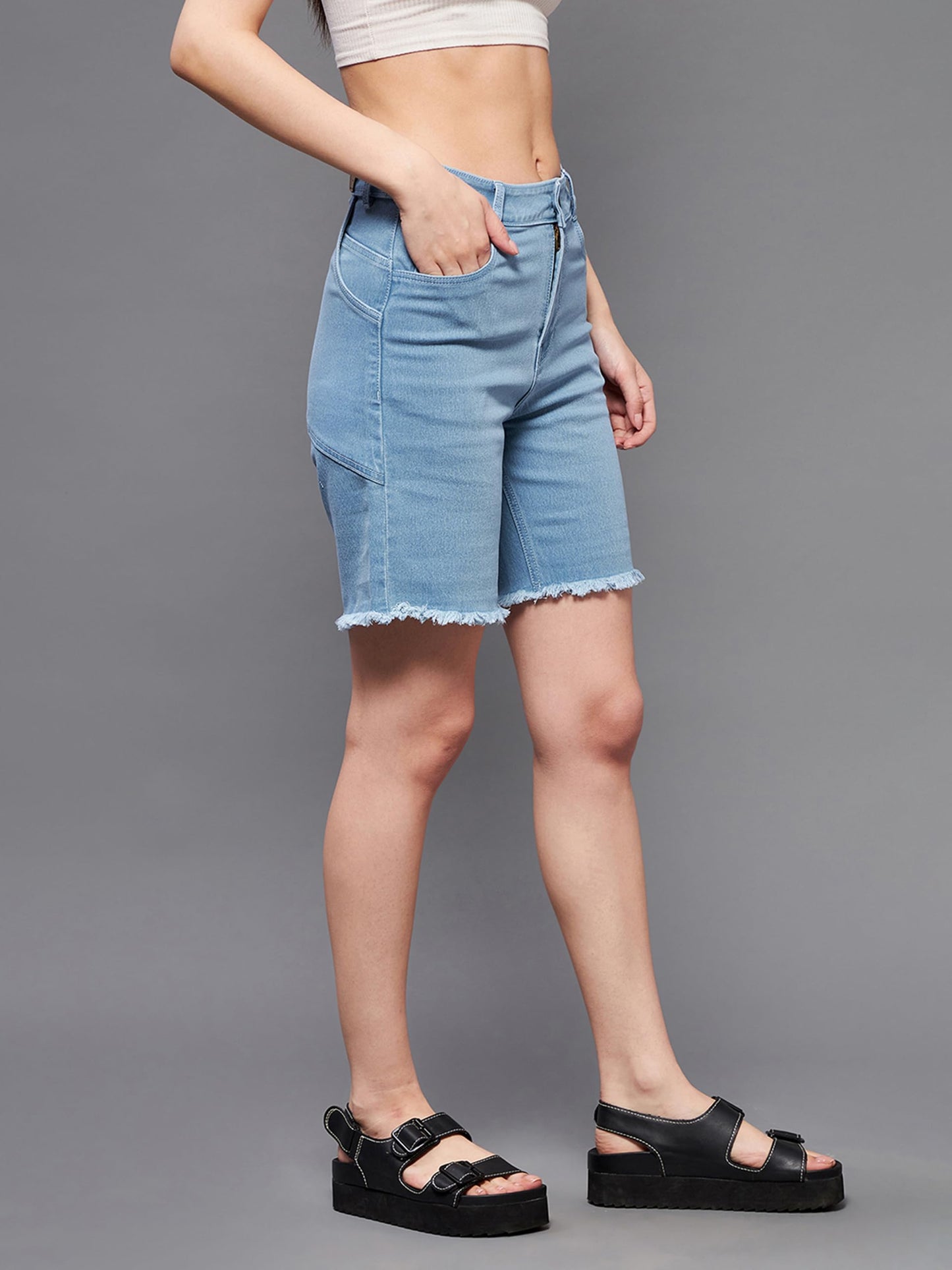 • Rise: High Rise | Fit: Regular | Style: Bermuda | Length: Above Knee | Distressed: Clean Look | Closure: Button and Zip Fly | Pocket: Side Pocket