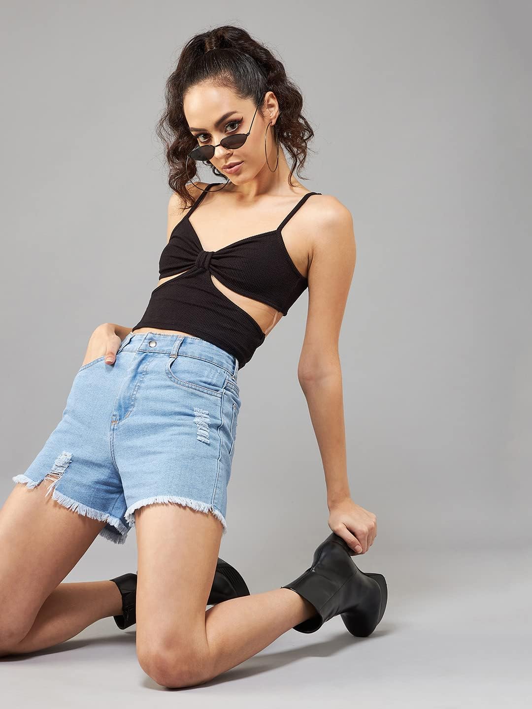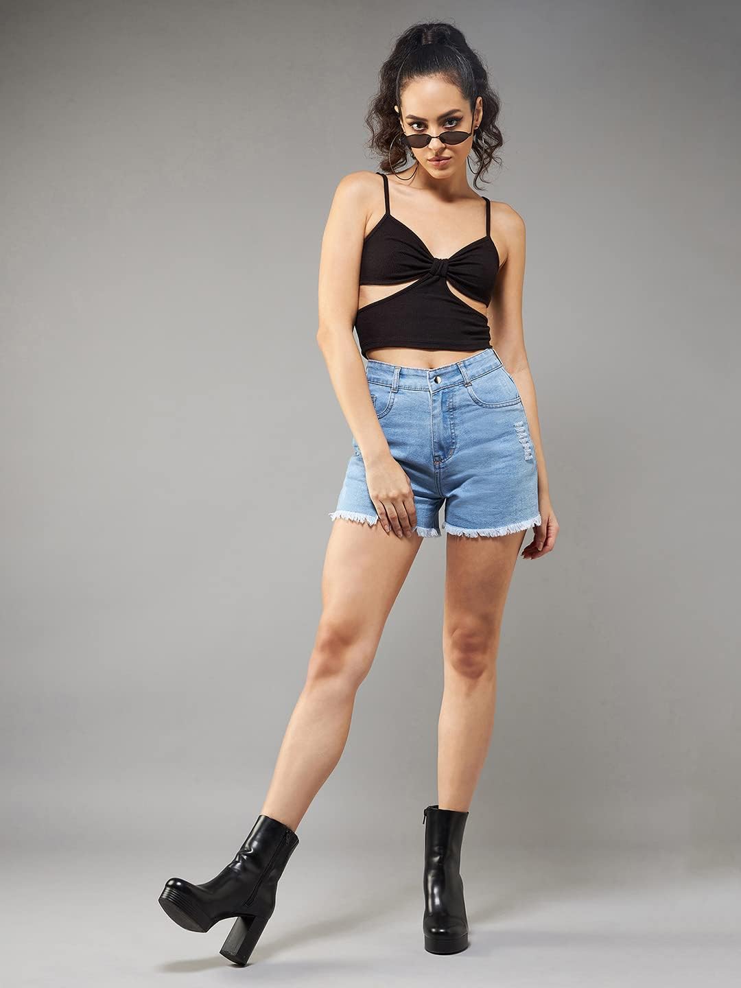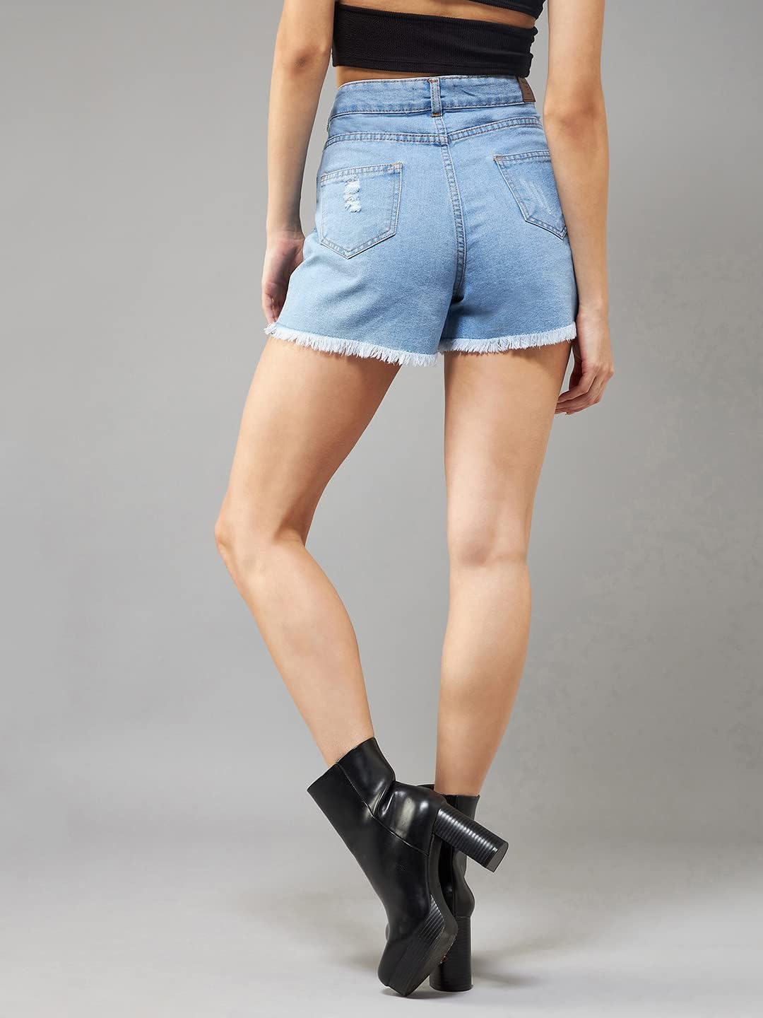Dolce Crudo Women's Relaxed Mid Rise High Distress Regular Non Stretchable Denim Shorts (DOSS22DEN09-09-115-38, Blue, 38)