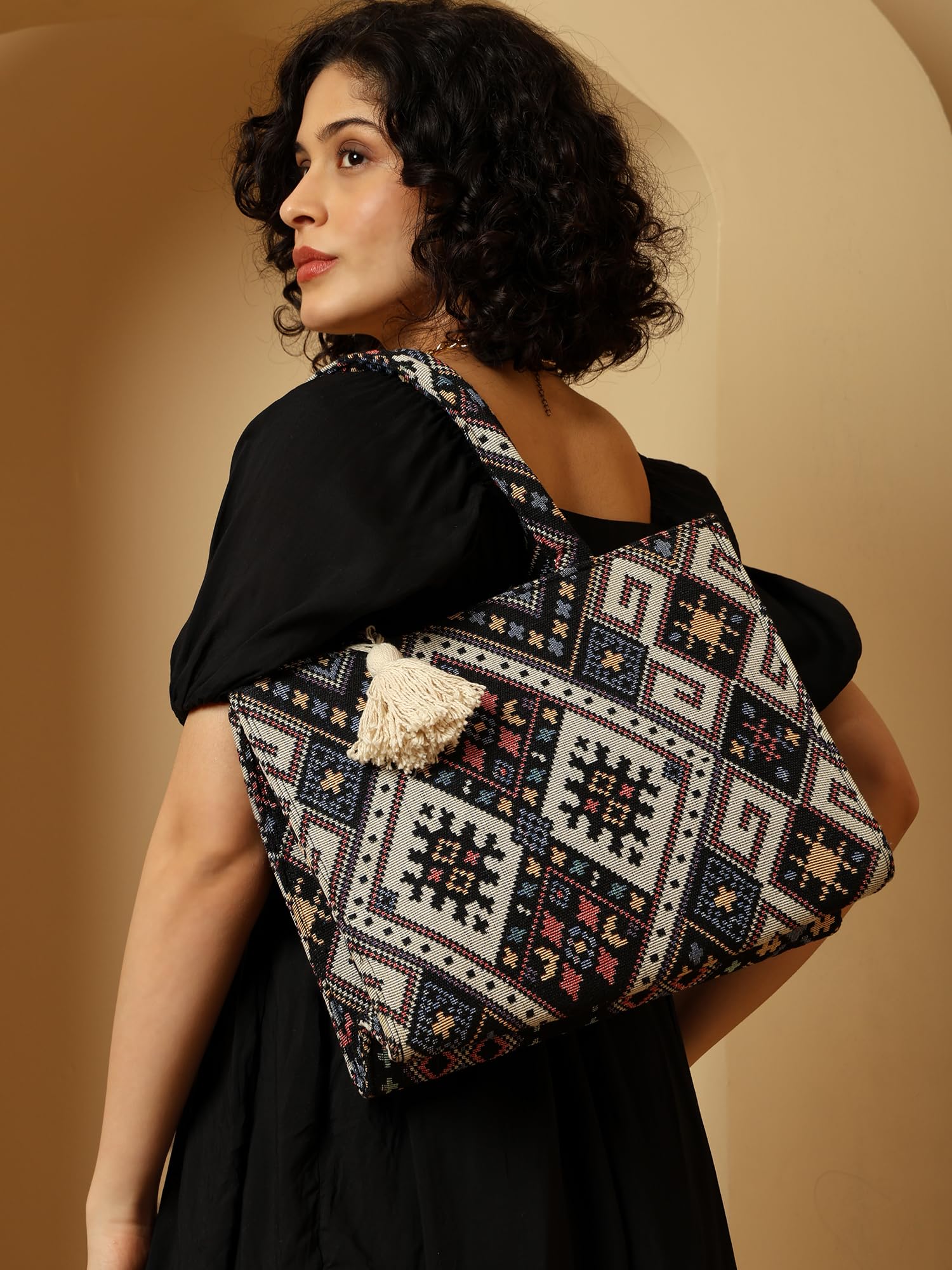 ENSAC Tote Bag for Women – Ethnic Embroidered Shoulder Bag with Tassel | Stylish Large Handbag for Office, College & Casual Outings