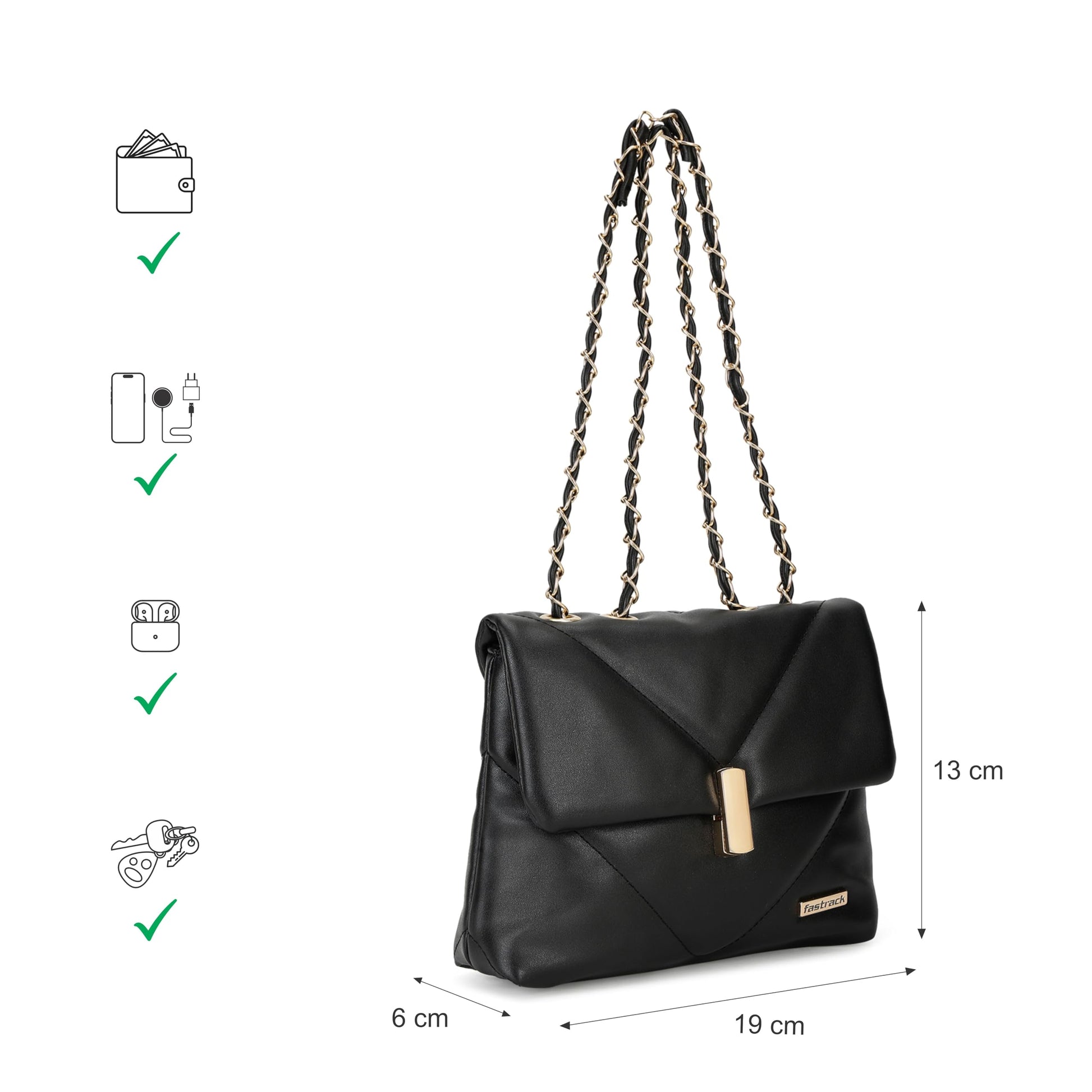 This Fastrack Quilted Sling Bag is a stylish and sophisticated accessory that combines elegance with functionality. The bag features a classic quilted design with a luxurious black finish, elevated by a striking gold-toned push-lock closure. The unique combination of a metal chain and PU strap for the sling offers versatility and adds a touch of modern flair. Fastrack sling bags, made from high-quality premium PU-like materials, are the perfect blend of style, durability, and convenience. Designed for modern lifestyles, these bags feature adjustable sling straps for a customized and comfortable fit, making them ideal for daily use or travel. Available in a variety of vibrant colors and unique textures, they cater to diverse tastes, ensuring a stylish accessory for every occasion. Their sleek yet functional design offers ample space to carry your essentials like wallets, phones, and keys with ease. Built to last, these sling bags are lightweight and easy to maintain, making them perfect for work, casual outings, or a day of exploring. With Fastrack sling bags, you can stay organized while elevating your style effortlessly.