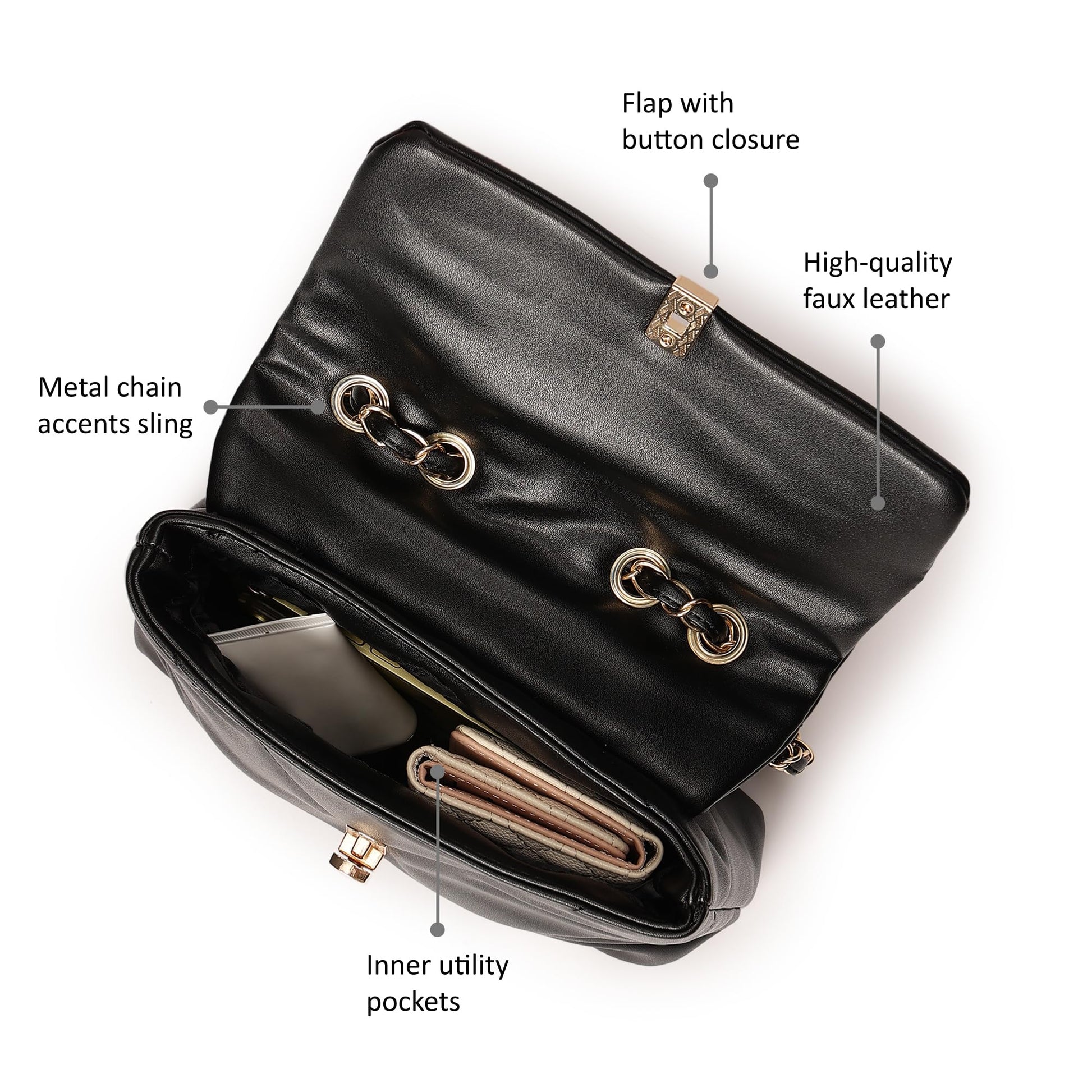 - Unique Sling Strap: The combination of a metal chain and PU strap for the sling offers versatility and adds a touch of modern flair.