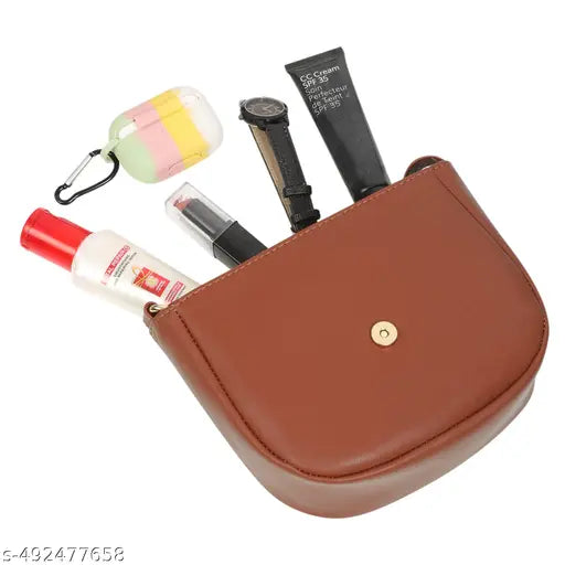 Tan brown textured sling bag 1 main compartment, has a button closure, 2 inner pockets, With a non-detachable sling strap