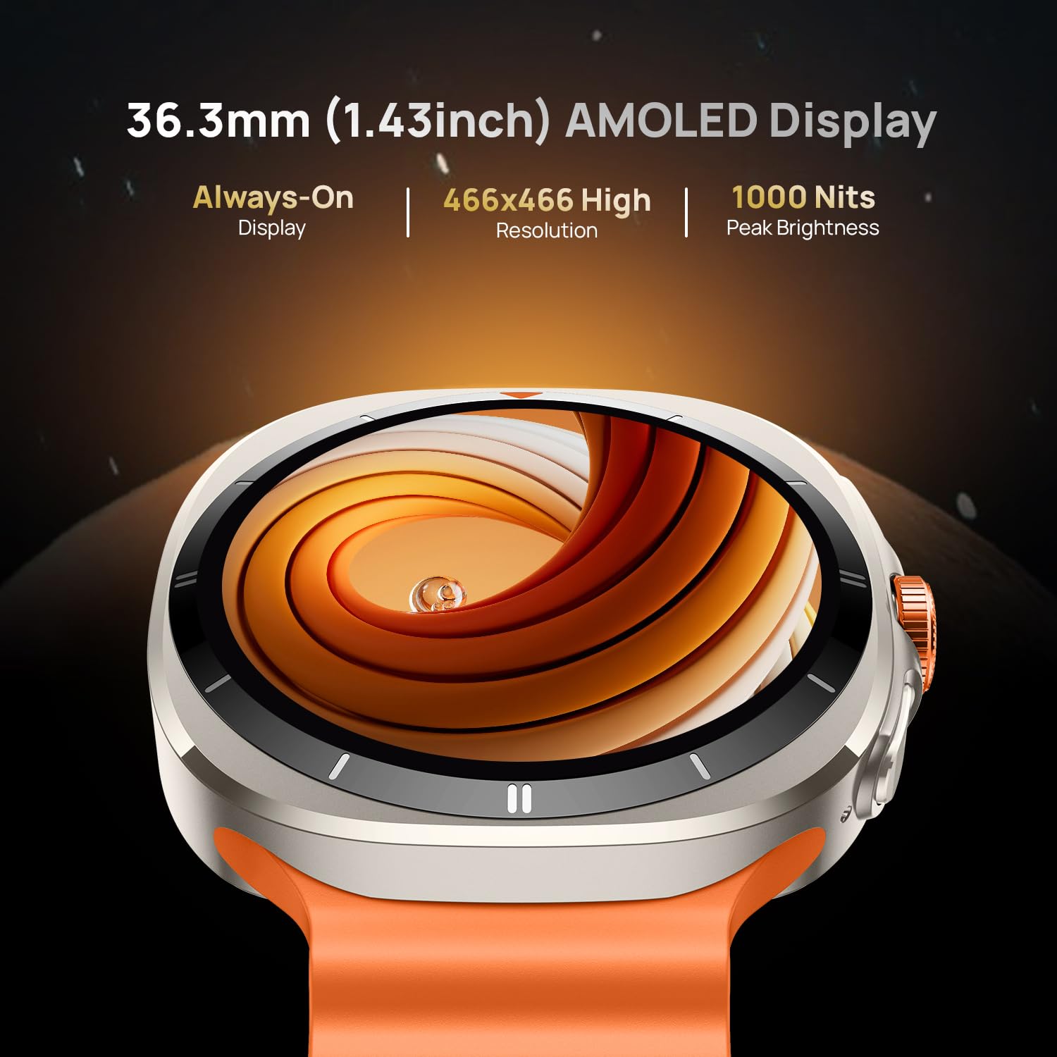 • VIBRANT AMOLED DISPLAY WITH ALWAYS-ON MODE: Experience stunning clarity with a 1.43" AMOLED display featuring a sharp 466×466 resolution and up to 1000 nits brightness. Enjoy vivid visuals with smart watch for men even in direct sunlight, with Always-On Display keeping key info visible at a glance.