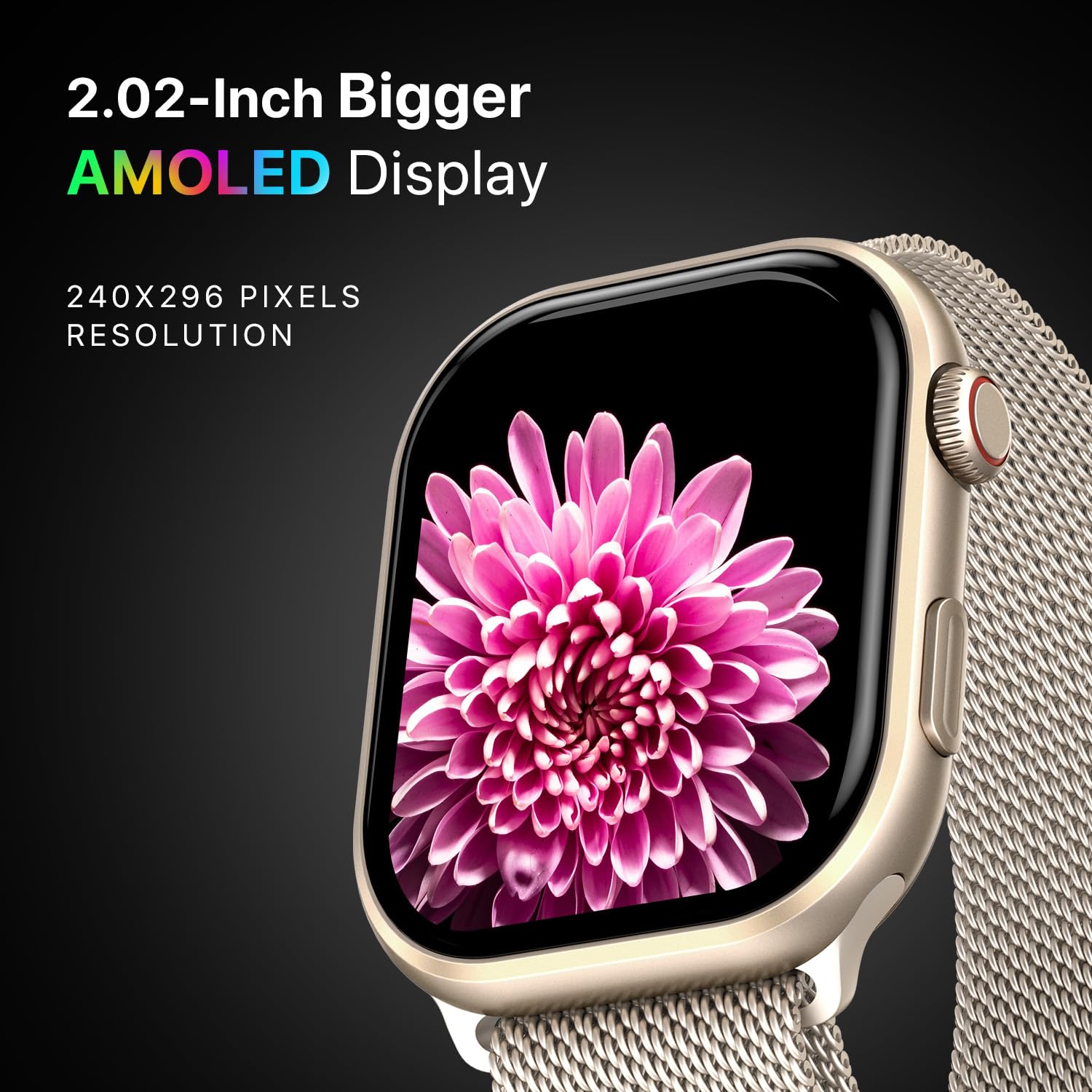 • (2.02") 51.3mm AMOLED Display with 750NITS Brightness: Experience vivid and clear visuals on the large 51.3mm always-on AMOLED display with a sharp 240x296 resolution and 750NITS brightness for enhanced clarity under any lighting.