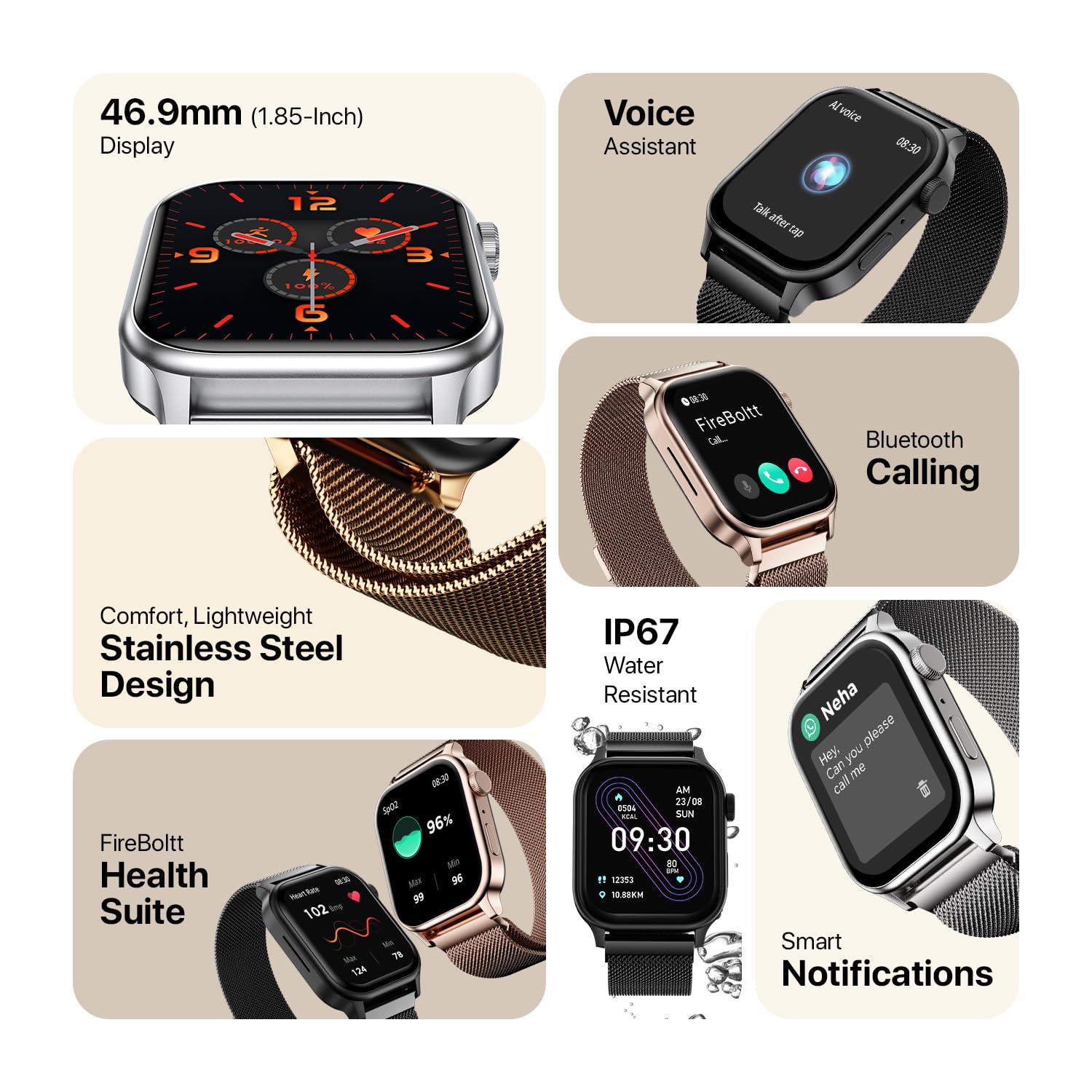 Fire-Boltt Rise Smart Watch, 1.85" HD Display, Metal Body with Bluetooth Calling, Rotating Crown, AI Voice Assistant, 120 Sports Modes, Neon UI, SpO2 & Heart Rate Monitoring (Black Millanese)