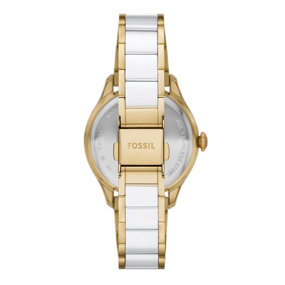 This 38mm round watch combines gold-tone and white ceramic craftsmanship with timeless design. Its gold-tone and white ceramic bracelet matches the sleek case, while the satin and sunray-finished white dial adds a refined touch. Designed for durability, the watch is both stylish and practical, making it a standout addition to any collection. Its clean and sophisticated design highlights lasting quality and attention to detail.