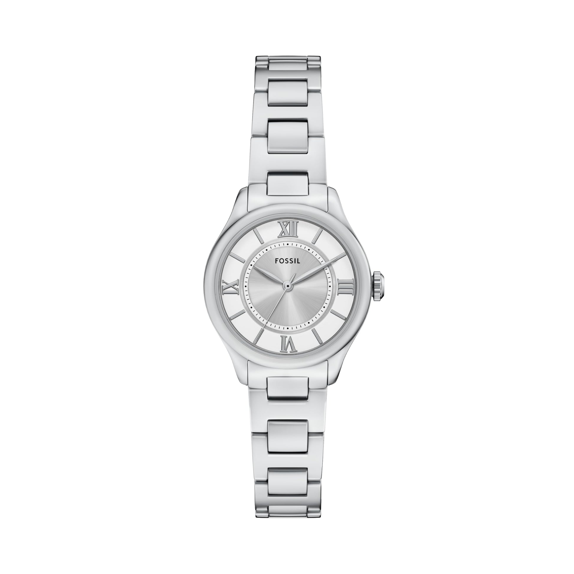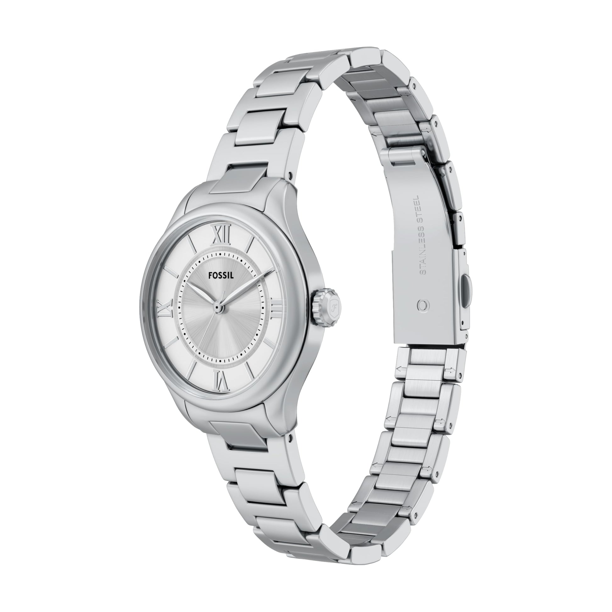 - Dial: Round silver stainless steel case, with a satin sunray silver dial.