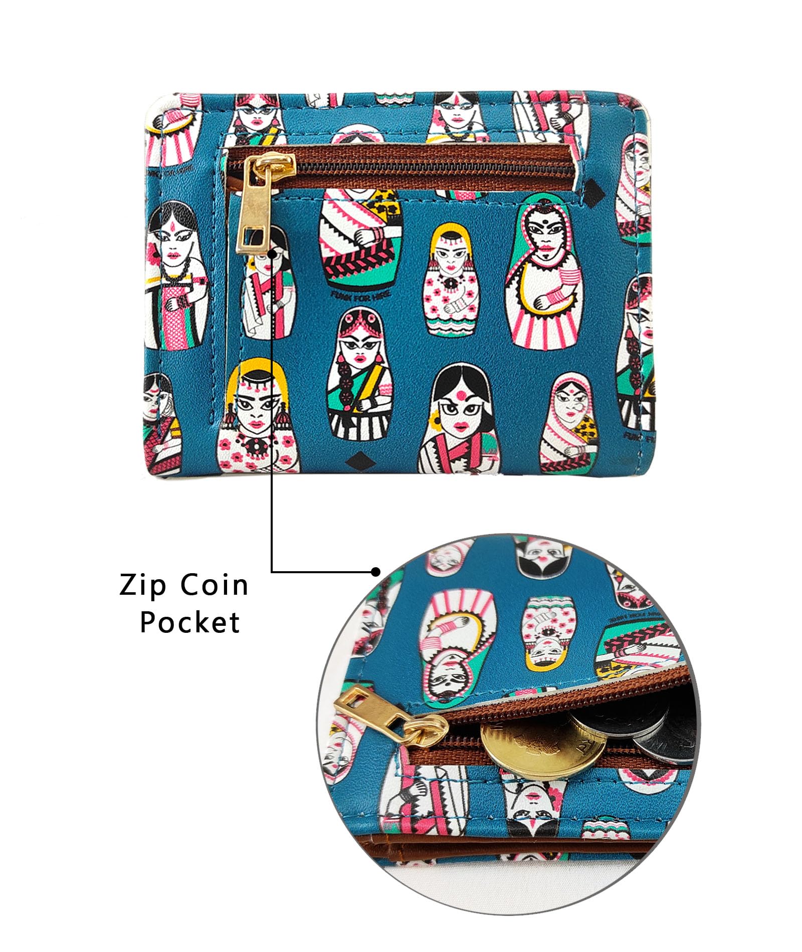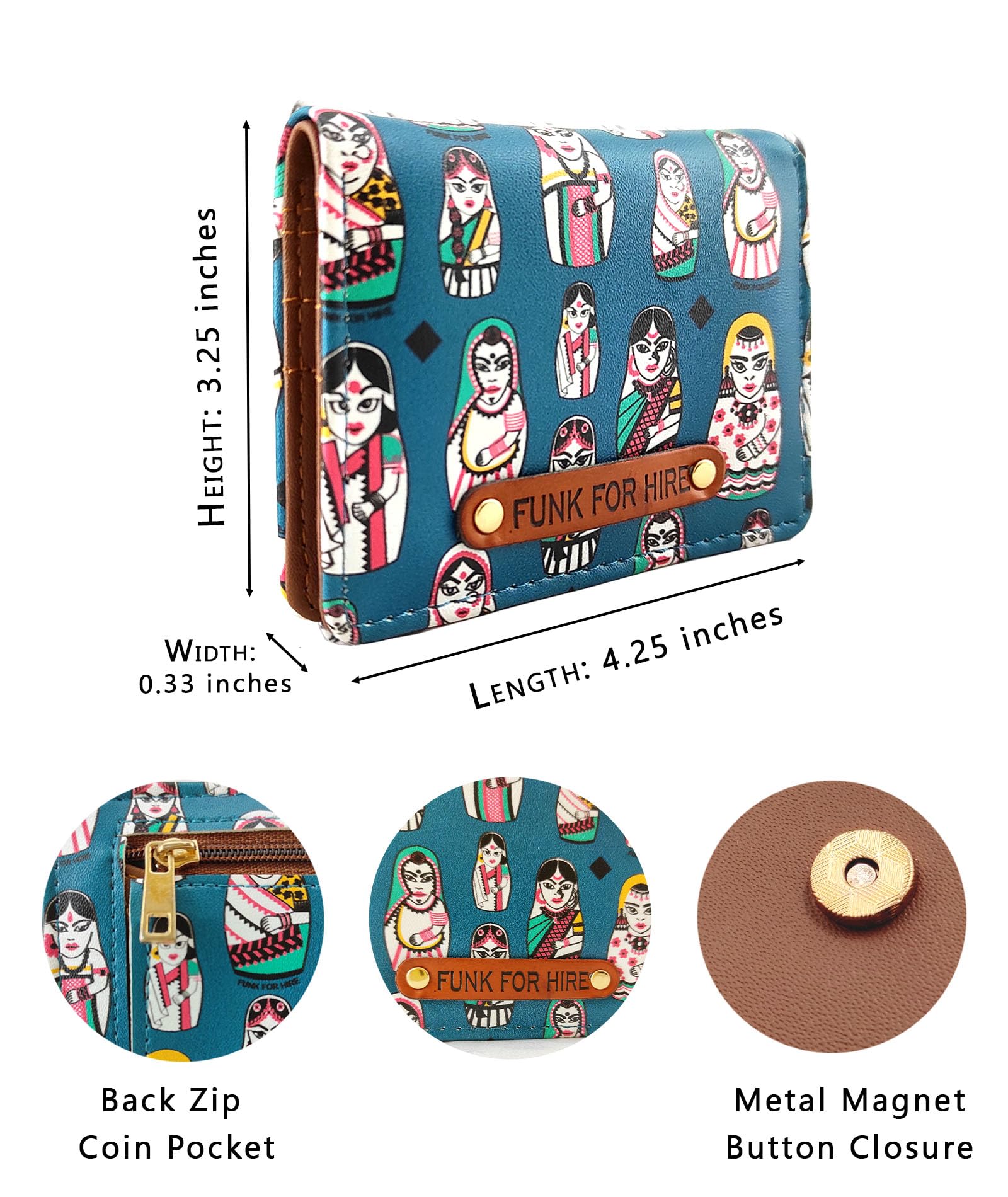 Funk For Hire Unisex Vegan Leather Small Card Wallet Teal Mini Bifold Wallet with 6 Card Slots Cash Compartment & Zipper Coin Pouch Compact Lightweight Durable Faux Leather