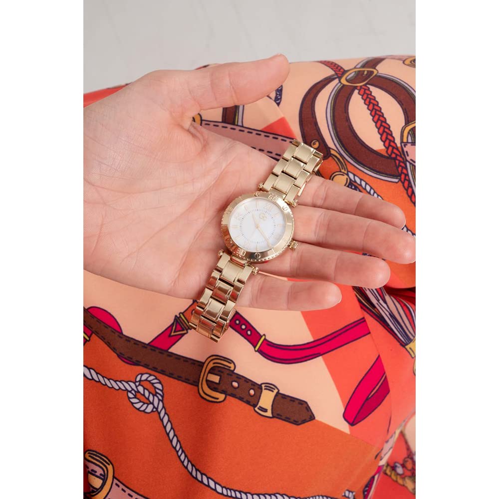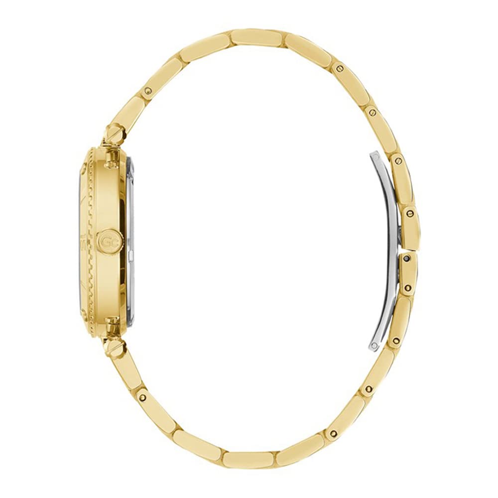 GC White Dial Quartz Analog Women Watch - Dial Color: White, Case Color: Yellow Gold, Case Material: Stainless Steel, Strap Color: Yellow Gold, Strap Material: Stainless Steel, Strap Closure: Deployment Buckle, Water Resistance: 100 m, Movement Type: Quartz Analog, Strap Width: 18 mm, Case Diameter: 34 mm, Case Thickness: 8 mm