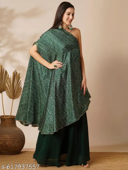 NameGlobus Women Green Bandhani Printed Embroidered One Shoulder Tunic & Georgette Elasticated Floor Length Skirt Fusion Co-Ord Set