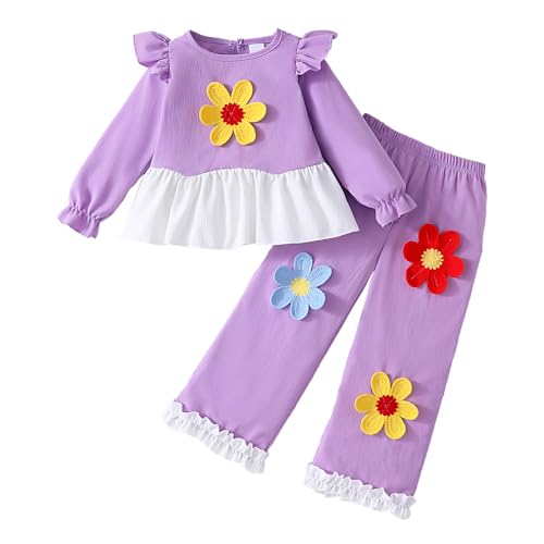 - Two-piece set with poet sleeve t-shirt featuring 3D floral applique and contrast white peplum hem paired with matching pant. Elasticated cuffs and white ruffle trim at trouser hem offer comfortable fit perfect for playtime and casual wear.
