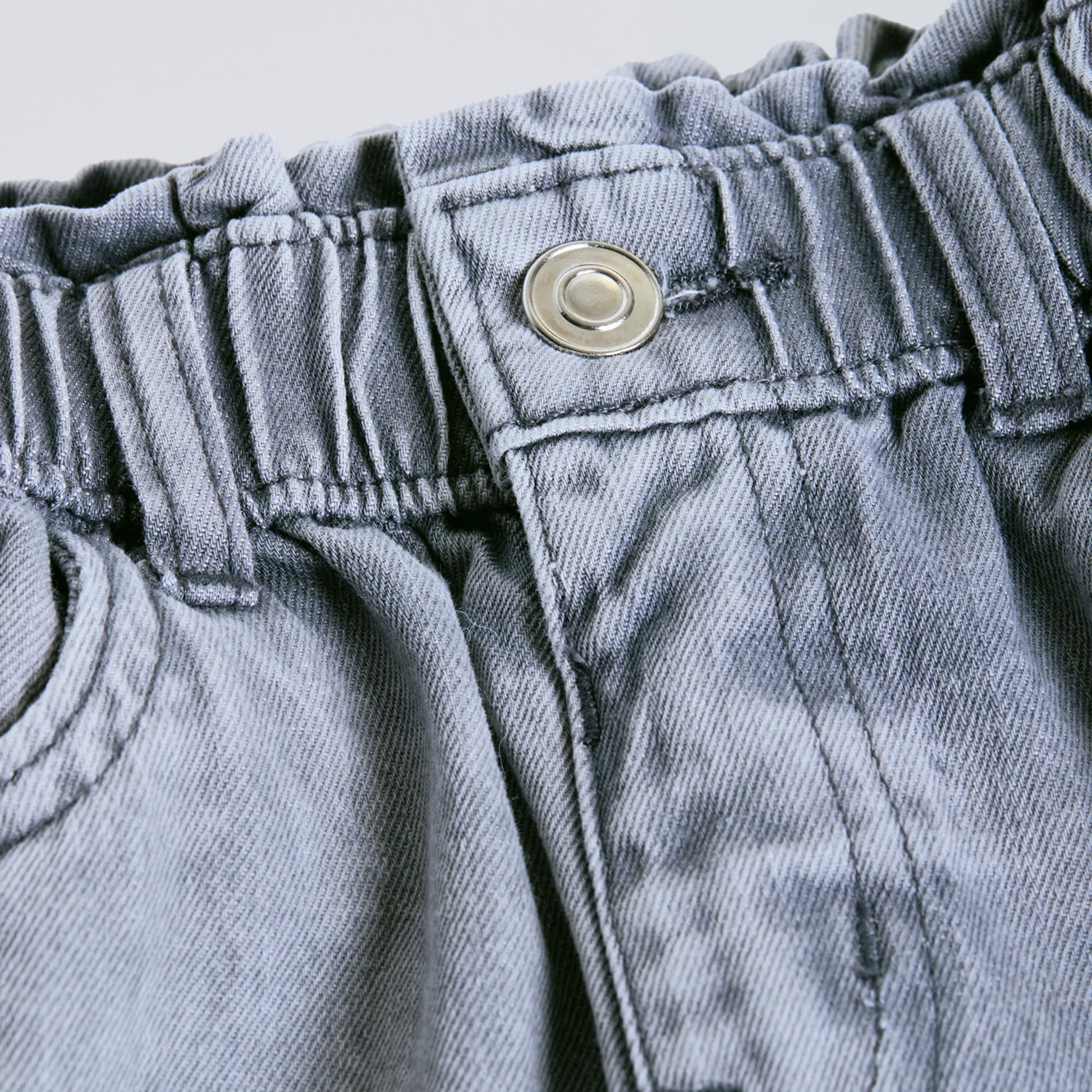 - Vintage-washed denim joggers showcase a trendy paperbag waistband with drawstring ties and classic jean pocket details.