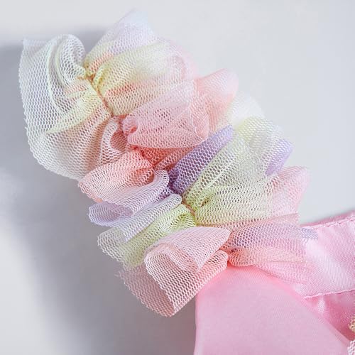 - Floral ruffle applique bodice meets puff-detailed skirt with delicate tulle overlay for garden party charm. Coordinating hair clip brings the look together.