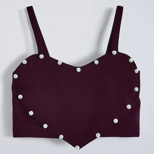 • Elegant burgundy meets sophisticated charm in this pearl-adorned two-piece featuring a sweet heart-shaped top and wrap-style skirt for special occasion elegance.