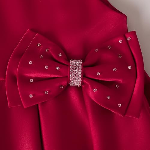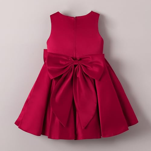 - Elegant magenta satin dress featuring sparkly rhinestone neckline trim, satin bow waist detail with jewel embellishment, and full pleated skirt. Sleeveless design with concealed zip fastening creates a princess-worthy look perfect for special celebrations.