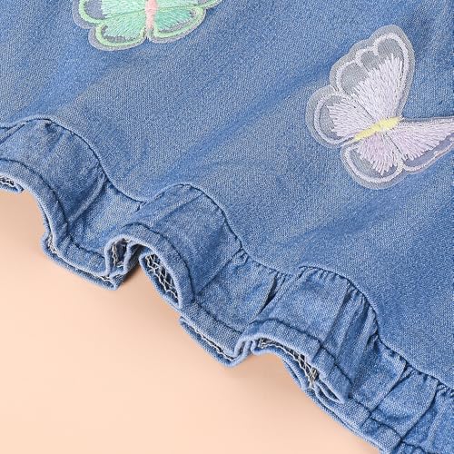 • Delicate butterfly appliques flutter across soft denim coordinates, bringing whimsical garden charm to classic chambray styling with colorful winged details and feminine ruffle accents.