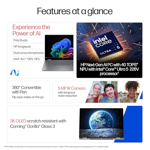 - Display & Graphics: 35.6 cm (14") diagonal, 3K (2880 x 1800), OLED, multitouch-enabled, 48- 120 Hz, 0.2 ms response time, UWVA, edge-to-edge glass, micro-edge, Corning Gorilla Glass 3, Low Blue Light, SDR 400 nits, HDR 500 nits, 100% DCI-P3 | Graphics: Intel Arc 130V GPU (8GB)