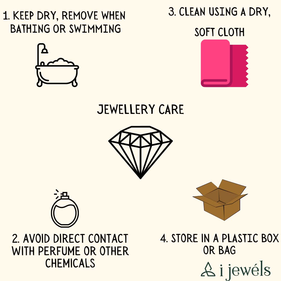 - 🔹 JEWELLERY CARE: To keep the jewelry looking its best, it's important to store it in a dry and cool place and avoid contact with water, perfumes, and other chemicals.