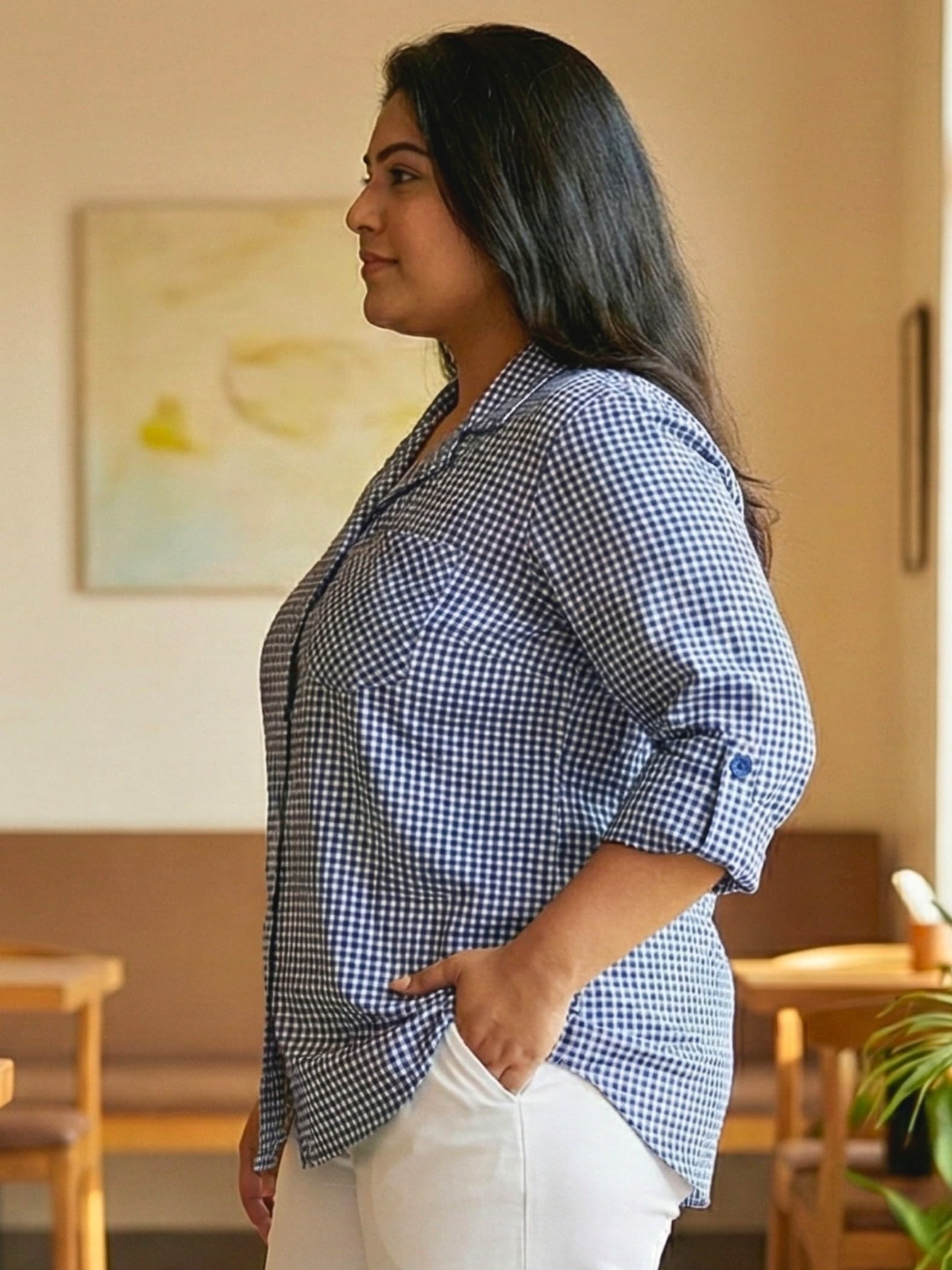 - Design: Timeless blue checks weave adds a smart yet casual look suitable for everyday wear