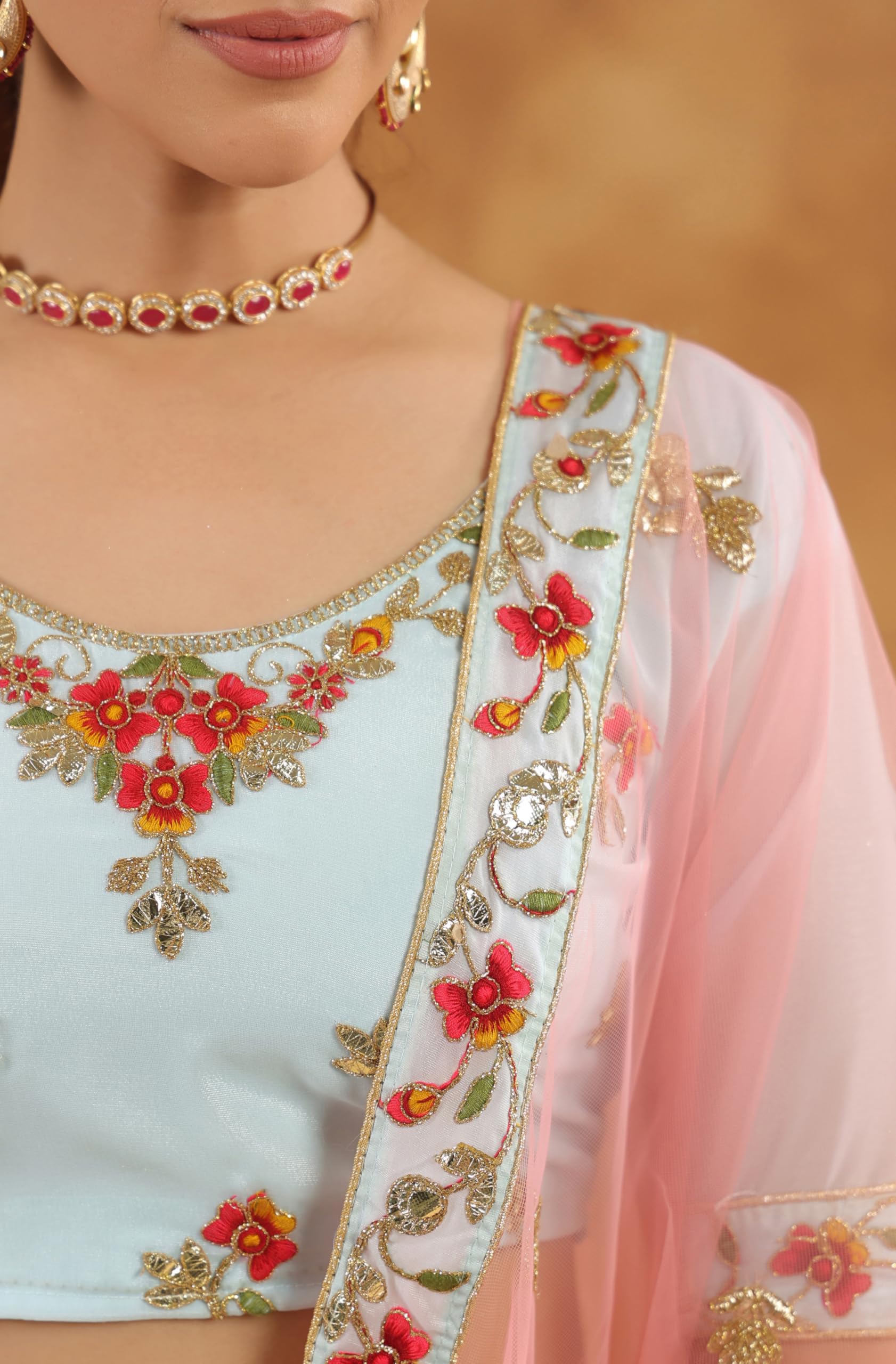 - Lehenga Color : Light Blue | Blouse Color : Light Blue | Dupatta Color : Peach