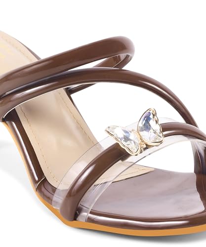 JM LOOKS Women's Kitten Heeled Sandal Open Square Toe Slip-On Transperent Strap with Embellished Butterfly for Wedding Party Prom - Brown