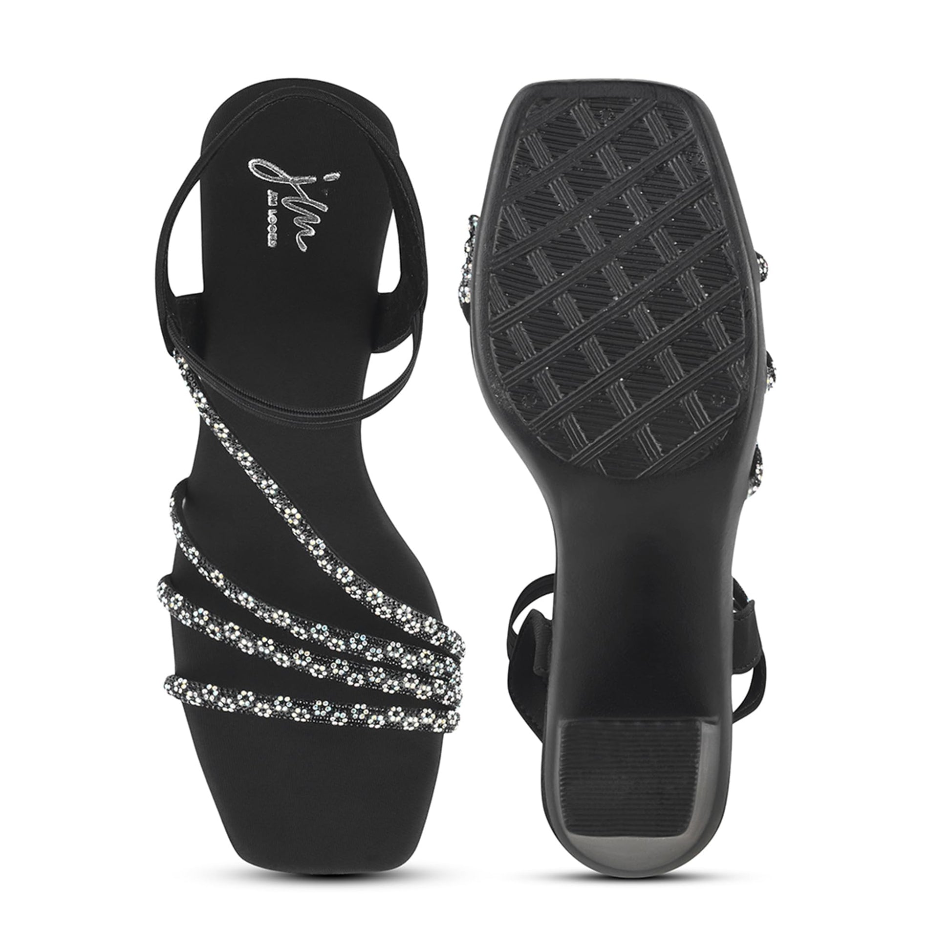 JM LOOKS Women's Sandal Strappy Embellished Heels Ankel Strap Square Toe Lightweight Comfortable Stylish for Wedding Party Festivel Occasion - Black
