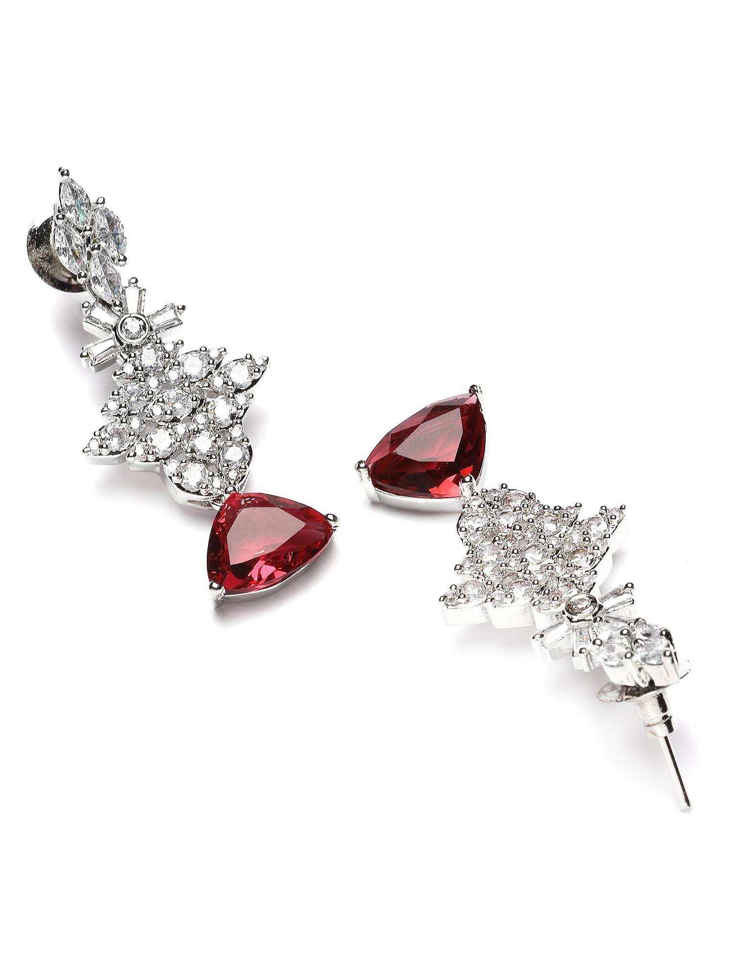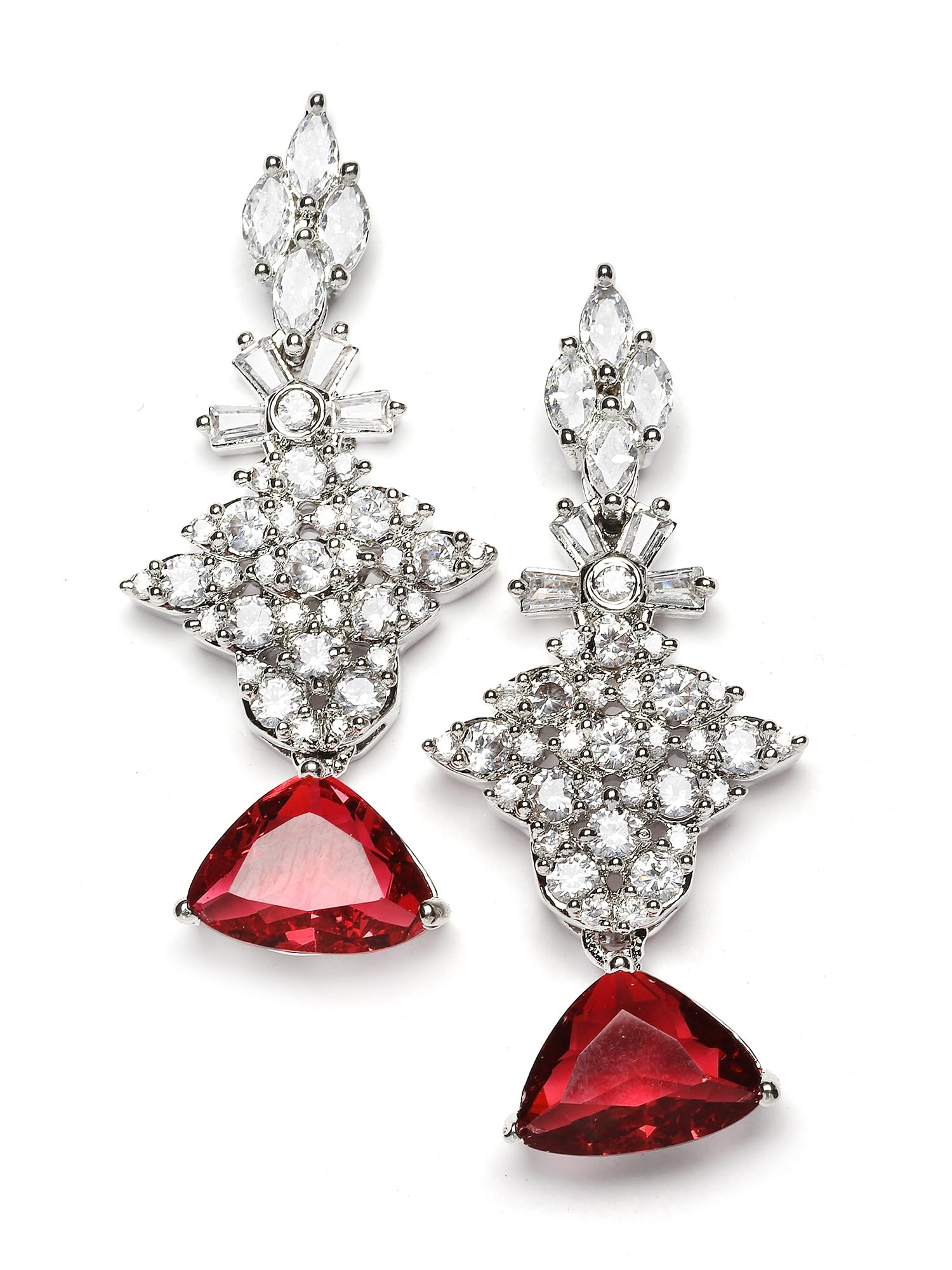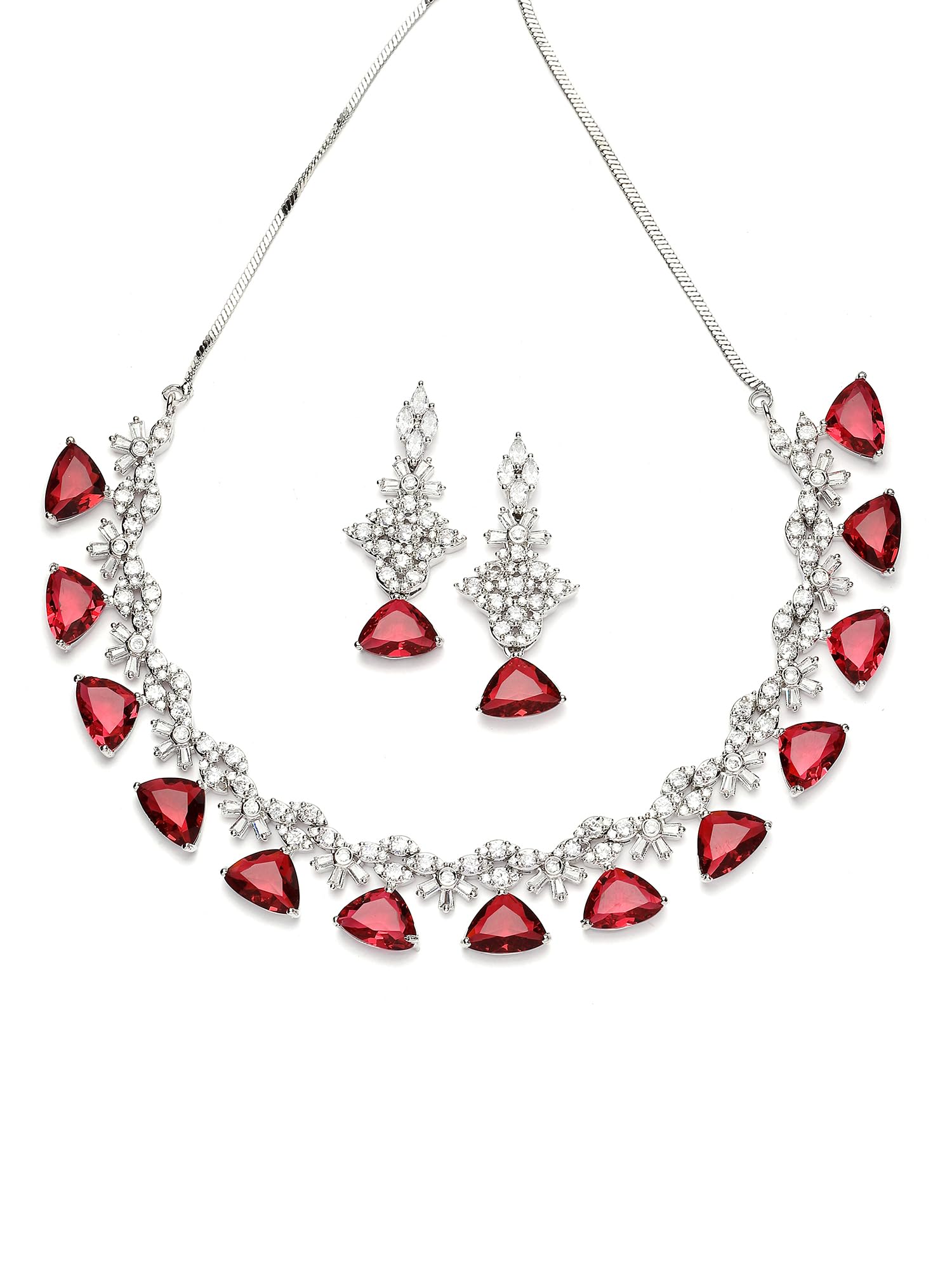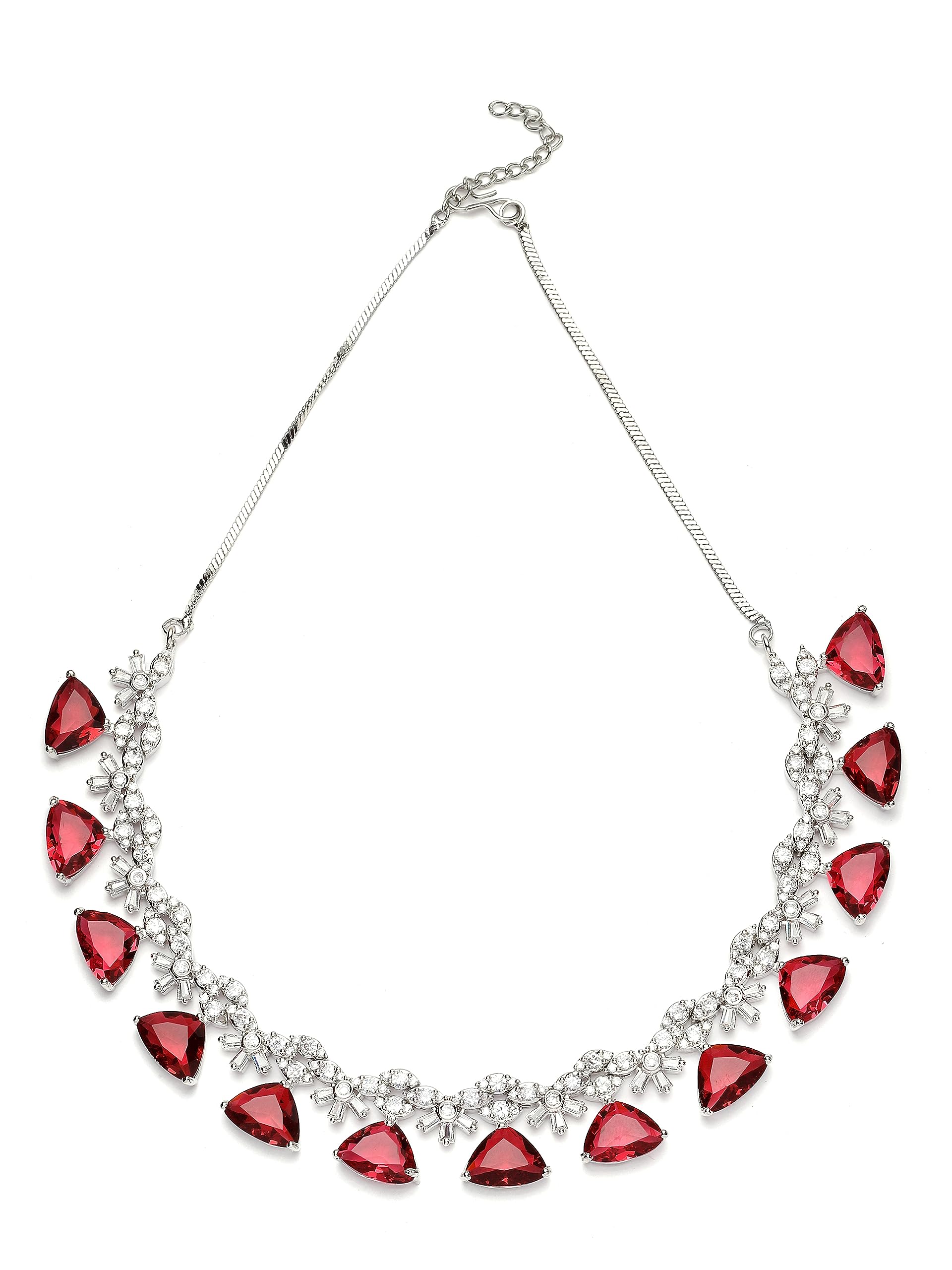• Karatcart Silver Tone Red Triangular Shape Cubic Zirconia Necklace Set for Women. Our products are designed with high-quality material and these products are enhanced with plating that are skin-friendly & with love to reach your heart.