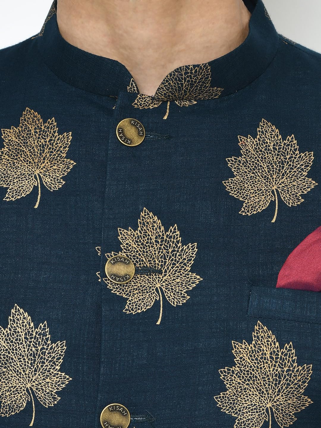KISAH Men's Indo-Western Sherwani Churidar Set, Blue Cotton Blend, Foil Print Regular Fit Mandarin Collar Long Sleeves (42)