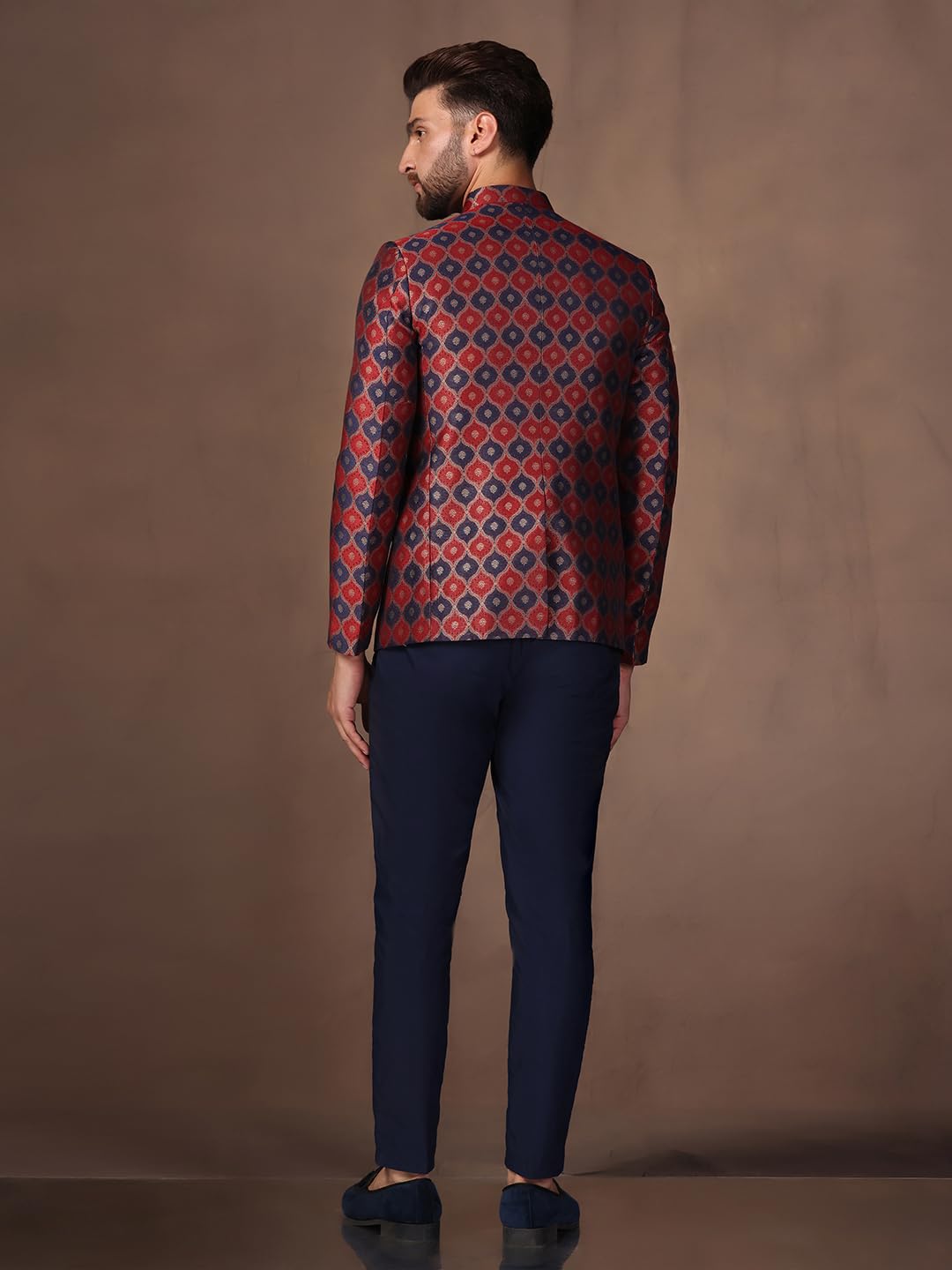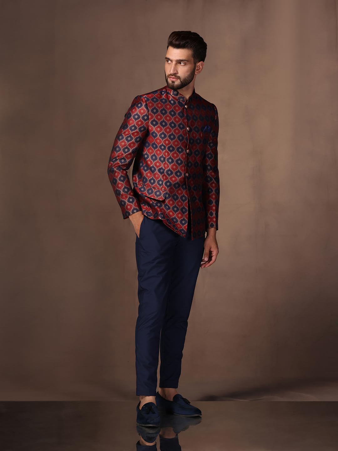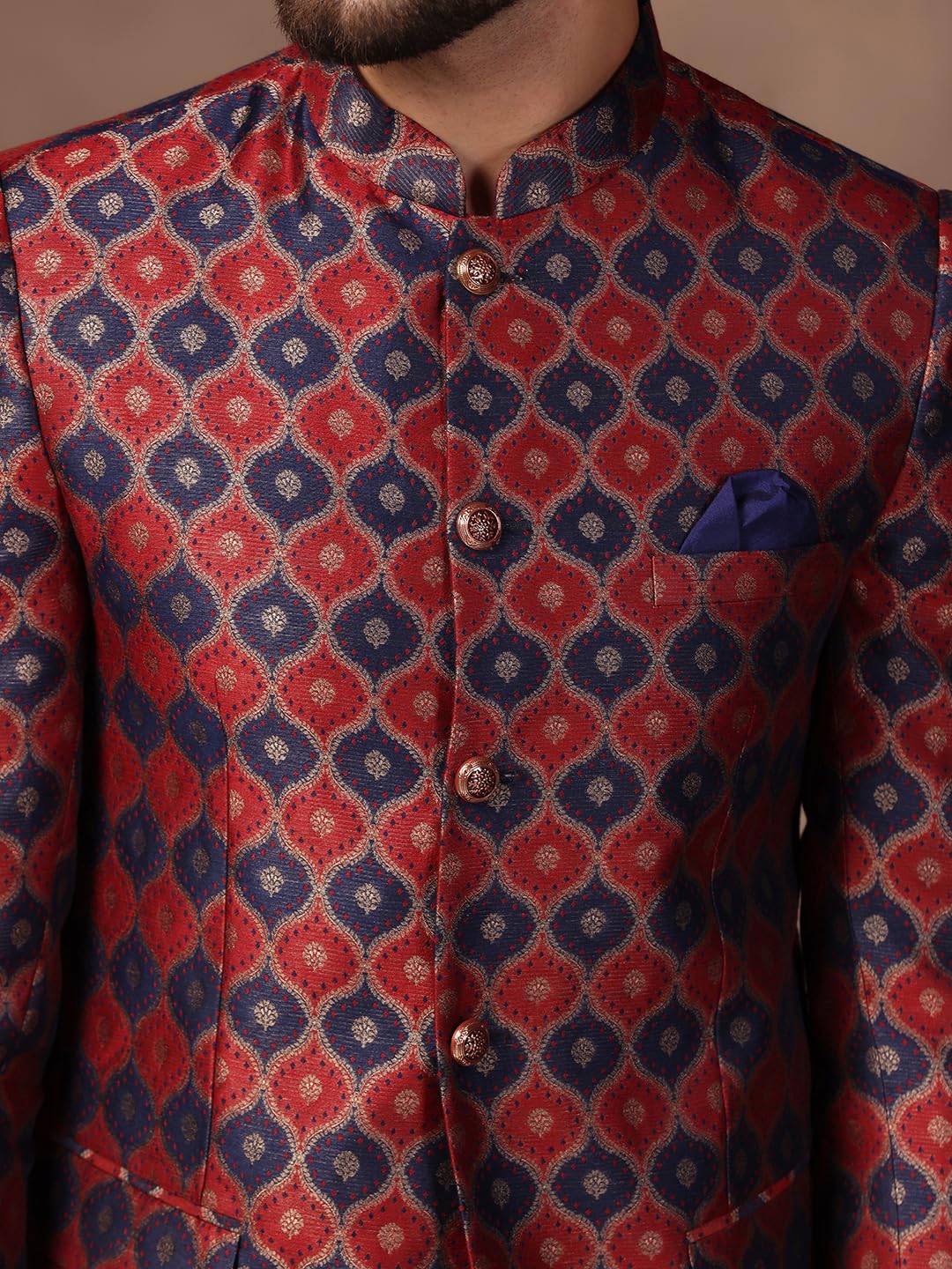 - Fabric: Silk Blend| Pattern: Jacquard| Package content: 1 Jodhpuri Bandhgala : 1 Trouser