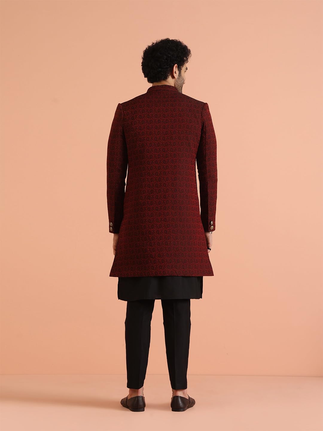 KISAH Sherwani Set for Men – Silk Blend Jacquard Indo Western Sherwani with Kurta and Trouser | Designer Ethnic Outfit for Weddings & Festivals, Maroon, 38