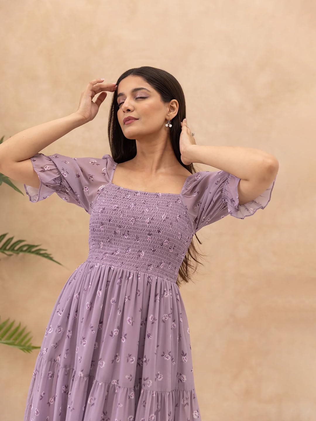 Step into timeless charm with this dreamy smocked midi dress, designed to flow with every step. Featuring a delicately gathered bodice, puff sleeves, and a tiered silhouette, this dress is a celebration of grace and comfort. The lightweight polyester fabric keeps it breezy, while subtle floral prints add just the right touch of romance. Perfect for brunch dates, casual outings, or garden events, this flattering piece effortlessly transitions from day to evening. Add a touch of whimsy to your wardrobe with this versatile statement dress.