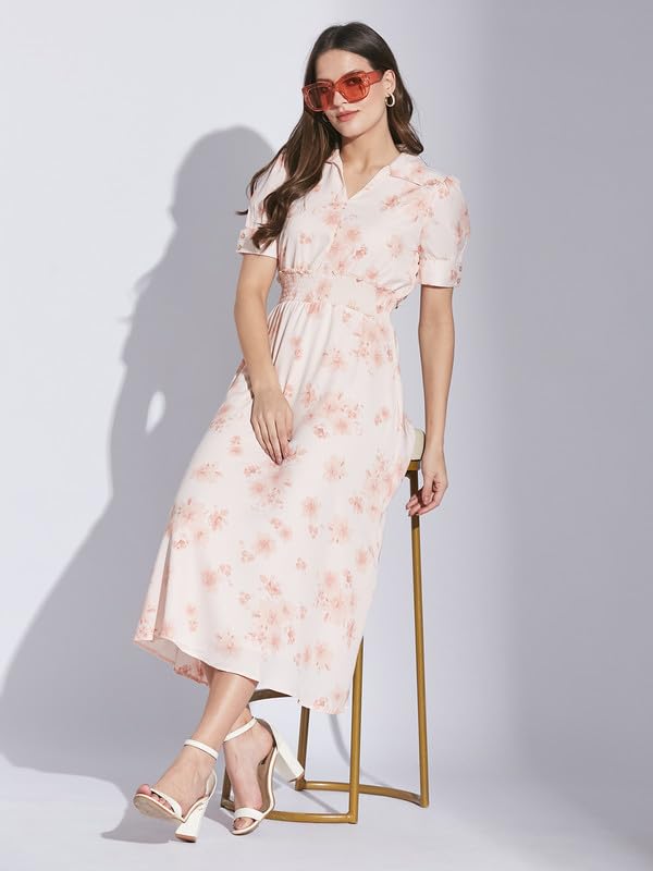 Latin Quarters Women Pink Shirt Collar Half Sleeve Floral Dress_M