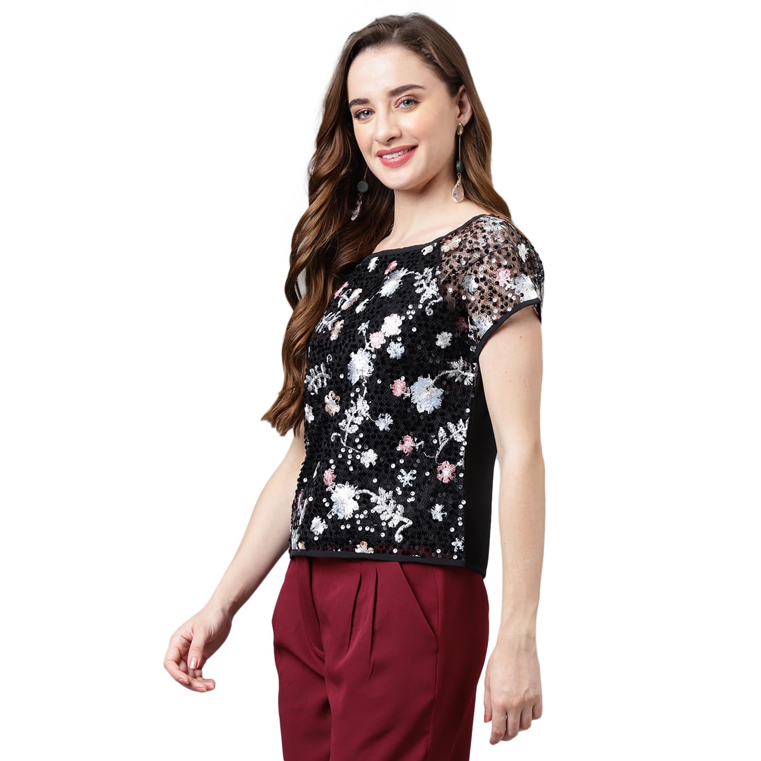 - Product Features-: Product Material-: Polyester || Color-: Black || Neck Line-: Round || Sleeve Type-: Cap Sleeve || Closure Type-: Pull On || Fit Type :- Regular Fit