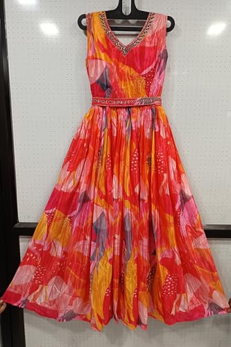 LAXMINARAYAN FASHION-Womens gownWomen's Multicolor Chinon Stitched Gown with Embroidery & Hend Worked Belt Anarkali Gown (in, Alpha, 2XL, Regular, Pink)