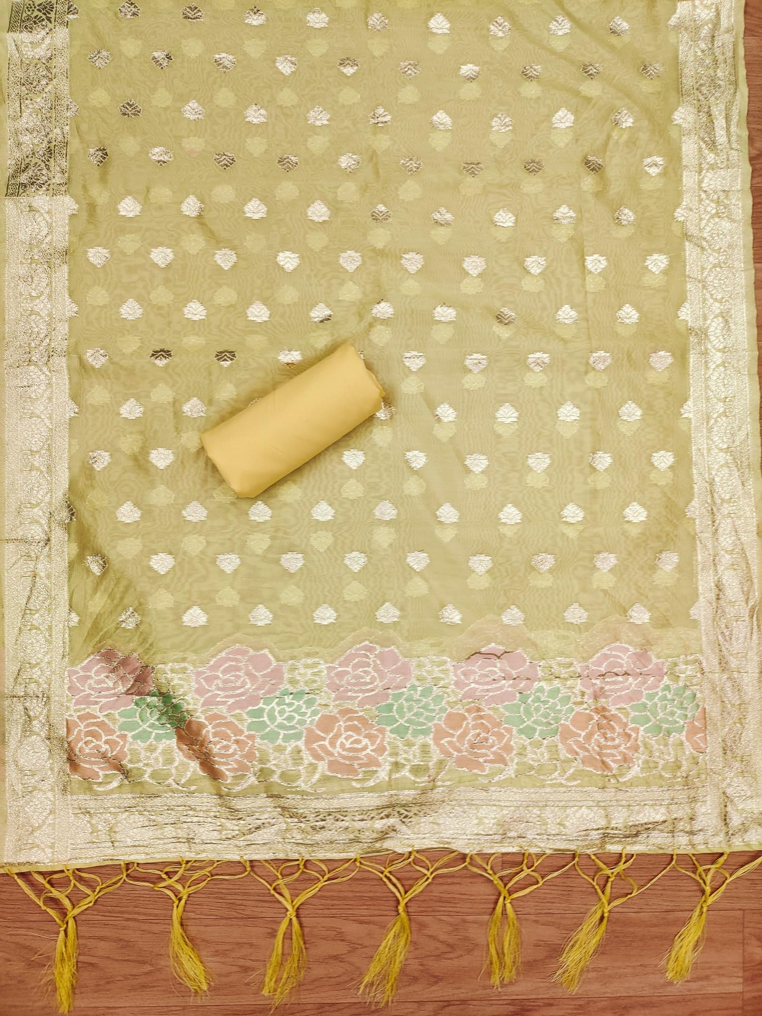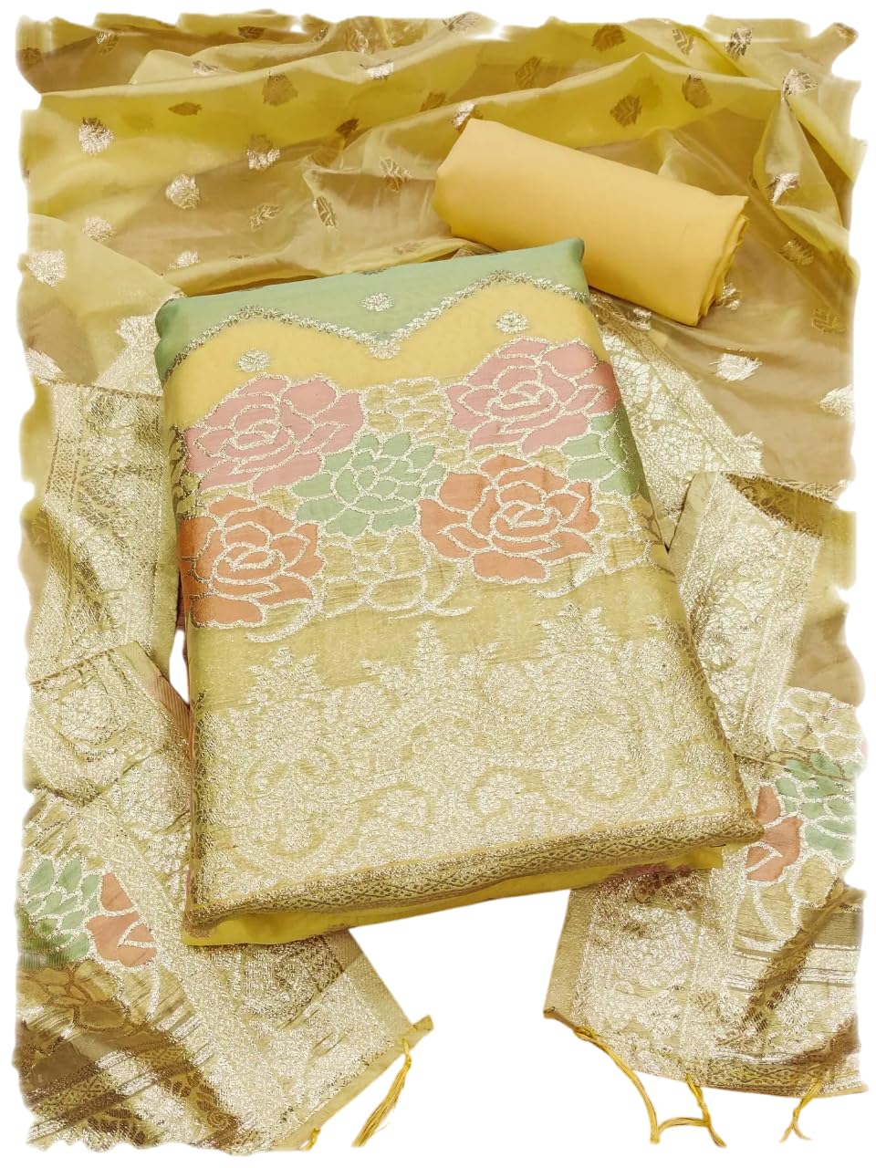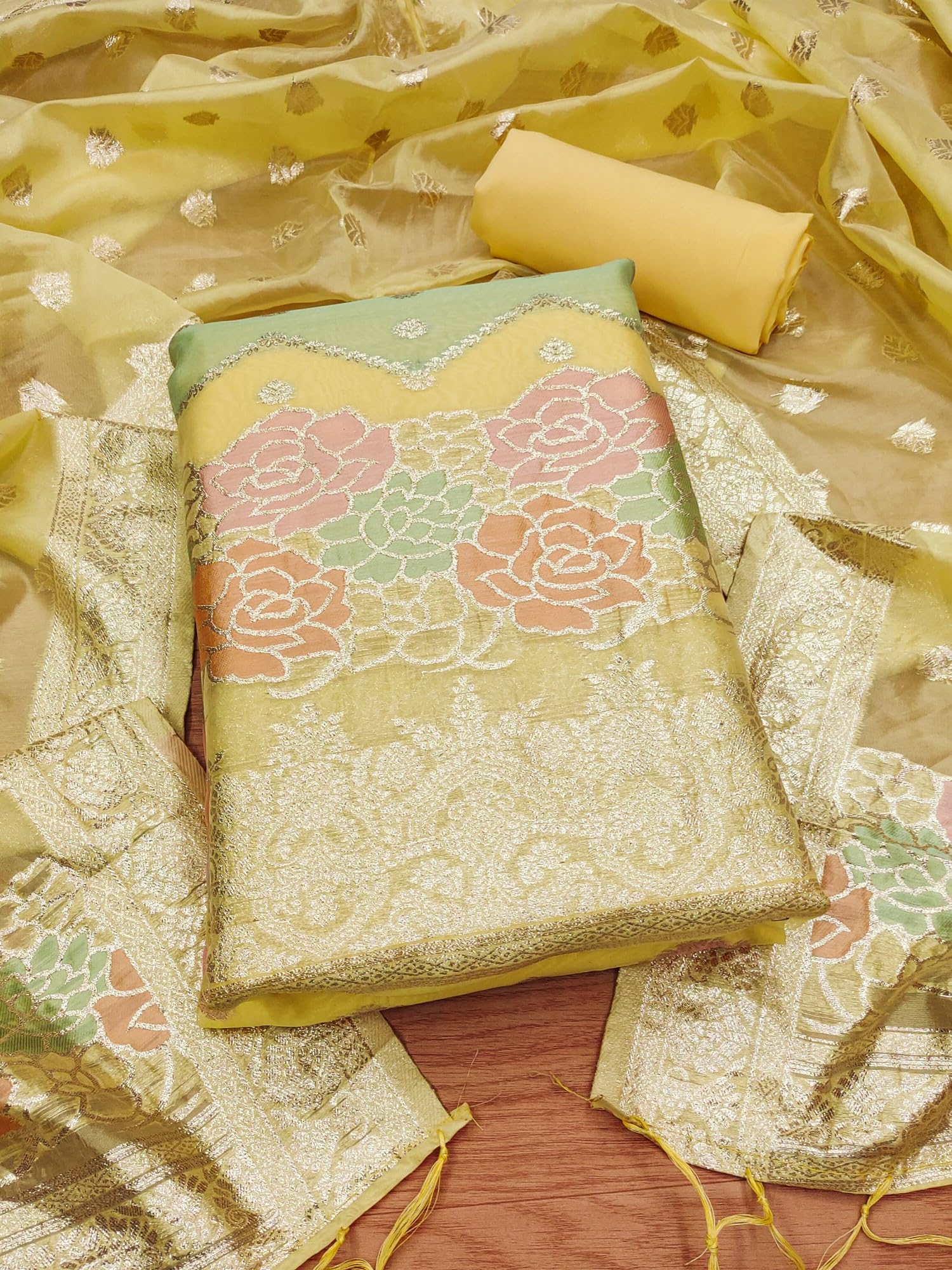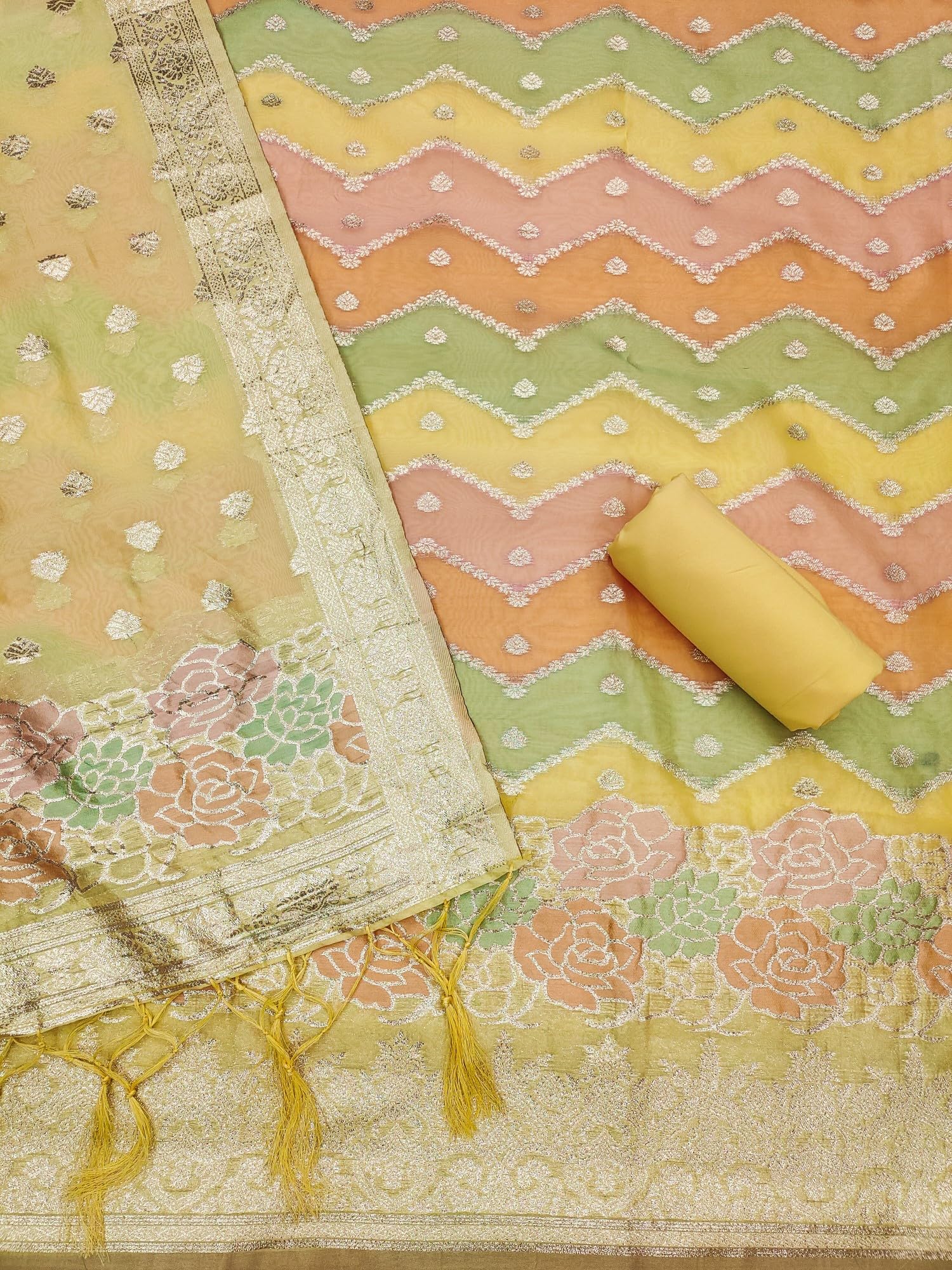 Leeli Peeri Designer Women's Yellow Organza Zari Woven Chevron Design Unstitched Dress Material(807PDM3)