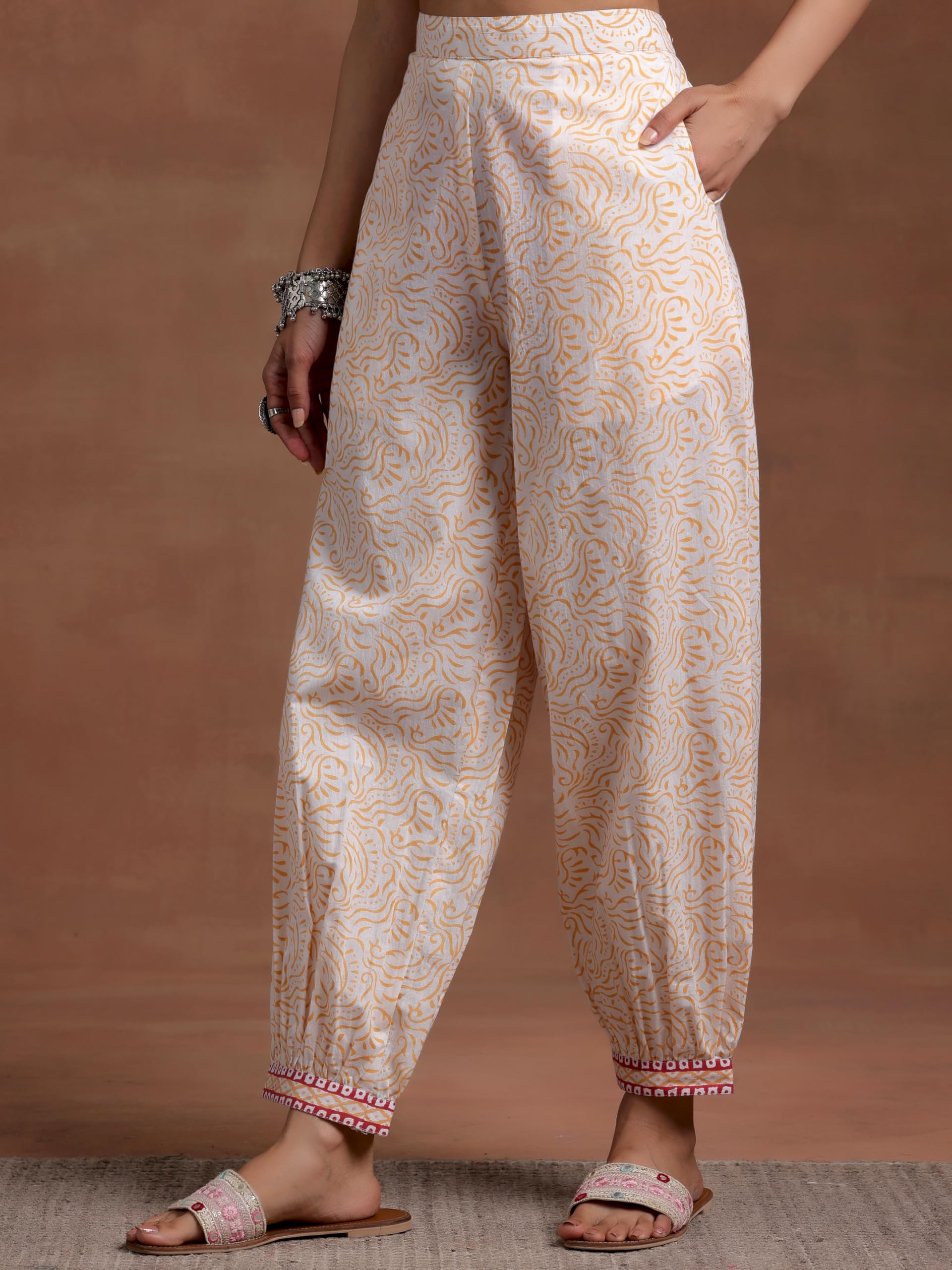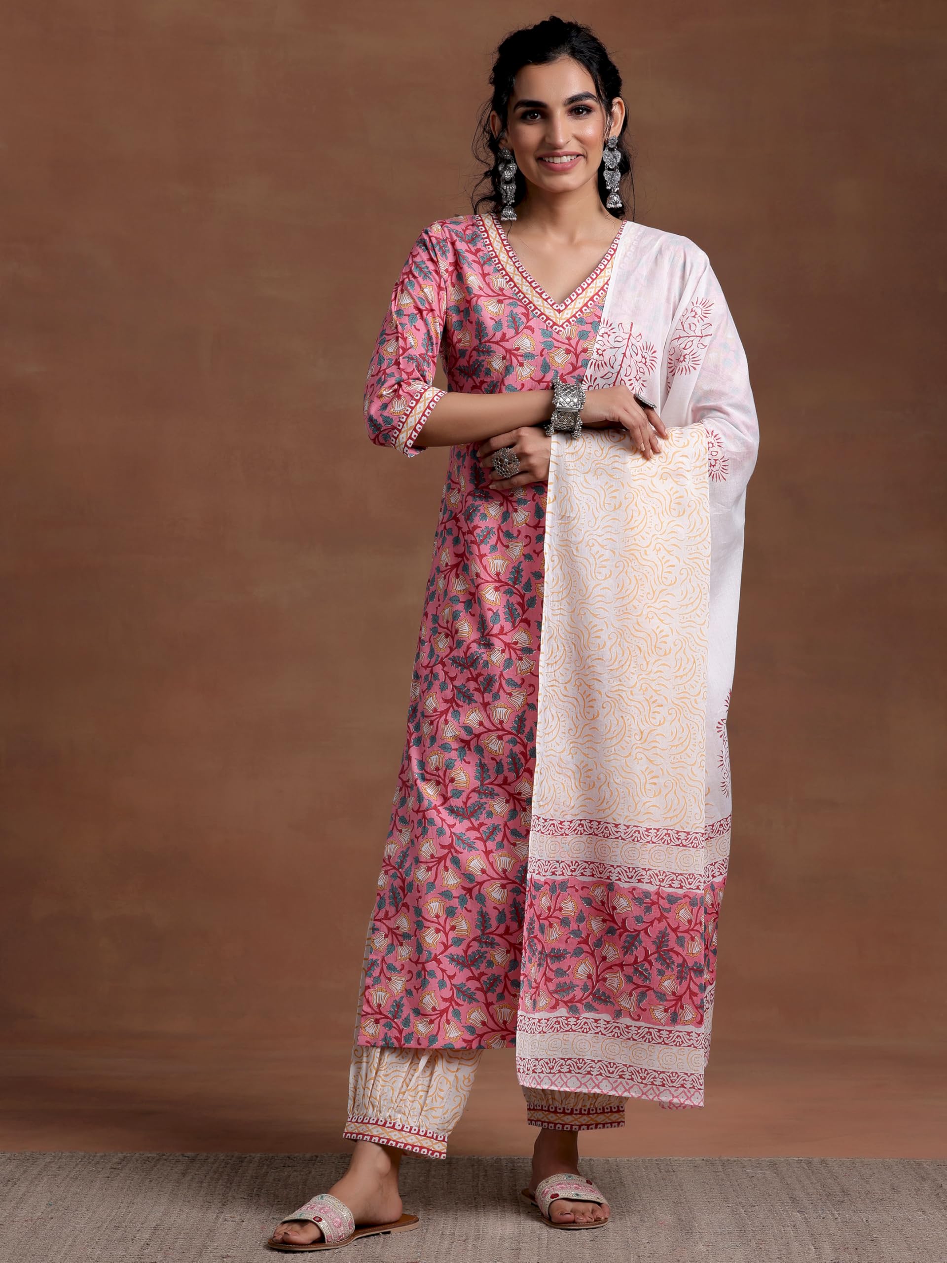 Our 3-piece pink printed cotton suit set features a straight-fit V-neck kurta with three-quarter sleeves. Complemented with Salwar trousers with a partially elasticated waistband and roomy pockets, and a dupatta. Highlighted with fabric-trim accents, and floral prints, this style is perfect for elevated everyday wear.
