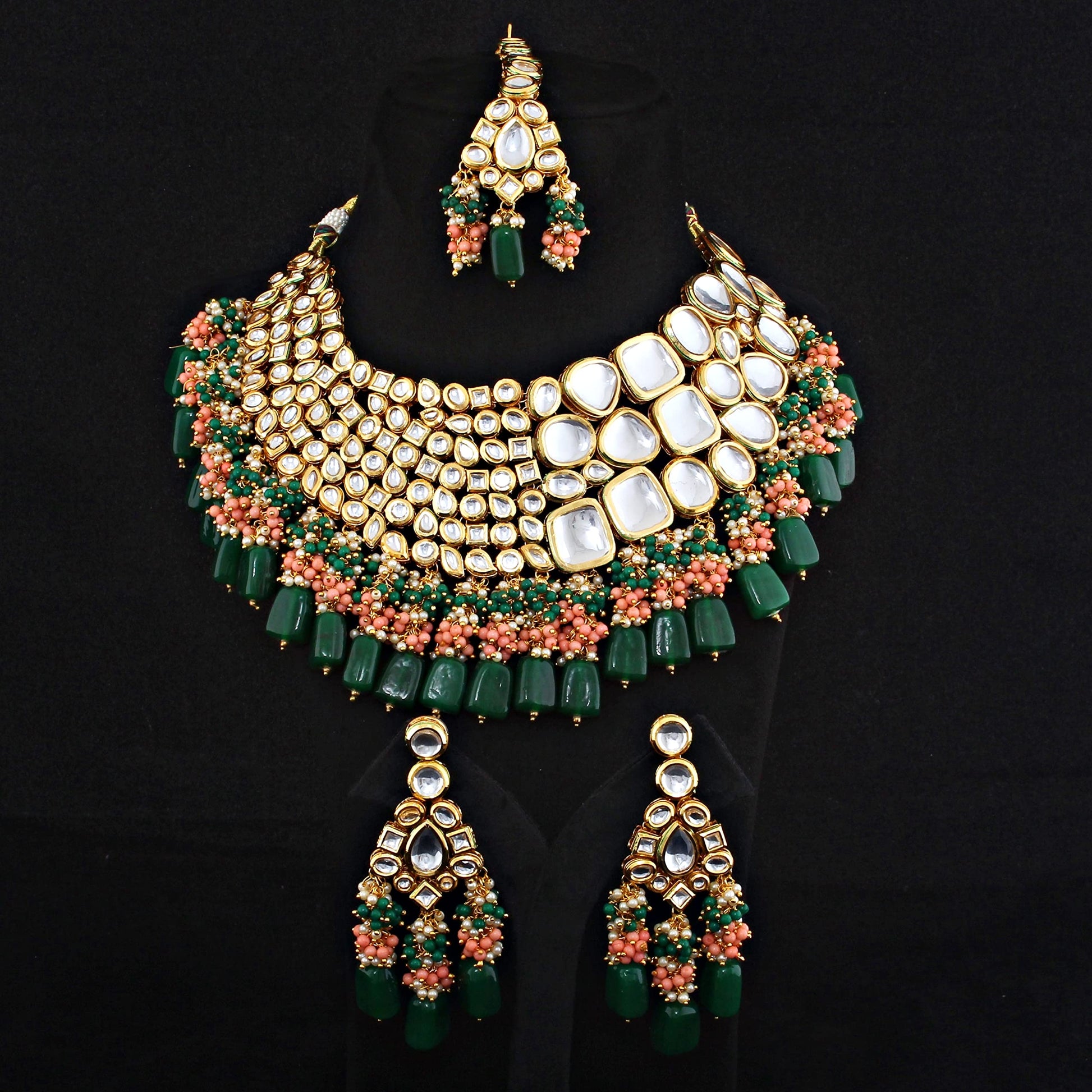 This stunning bridal set from Lucky Jewellery will certainly delight all the lovely Indian girls, who are ready to get married. This bridal set includes Mang Tika, One necklace, matching earrings. Further, this set is studded with finest quality of coloured and white stones that render amazing look.