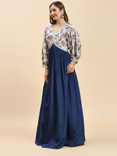 - STAND OUT FROM THE REST: Keeping in mind the latest fashion trends, this designer Kurti is made to help you make a bold fashion statement. The solid Navy Blue and multi-colour long Gown dress for women's Latest Design pattern highlights the colour of your choice which is accented further.