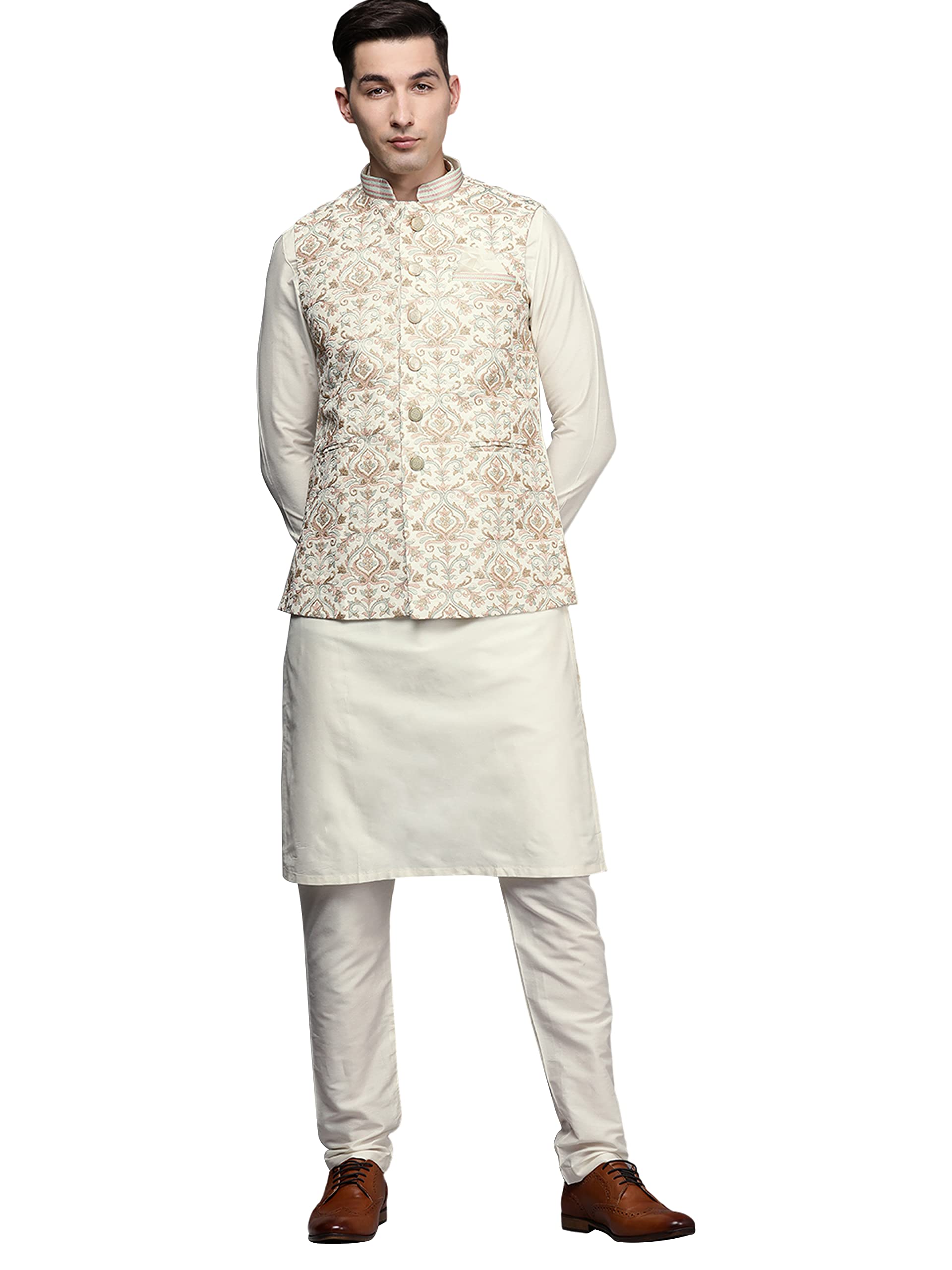 Manyavar Kurta Jacket Set for Men, Full Sleeves Mandarin Collar Ethnic Kurta Jacket Set for Festival, Wedding, Party Blended Viscous (Off White) (M)