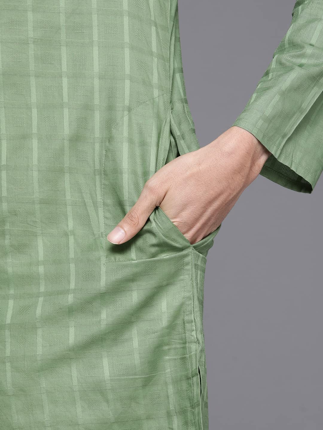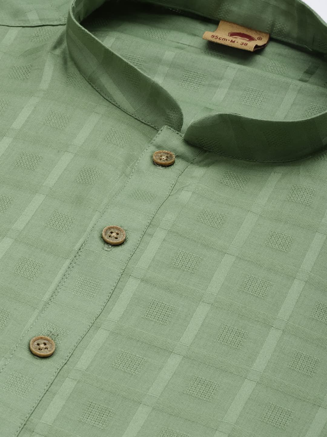 - The moss green kurta set focuses on modern aesthetics and traditional design. The set features sharp chequered patterns, a classic bandhgala neckline and brown buttons, making it a versatile addition to your wardrobe. Best paired with black loafers.