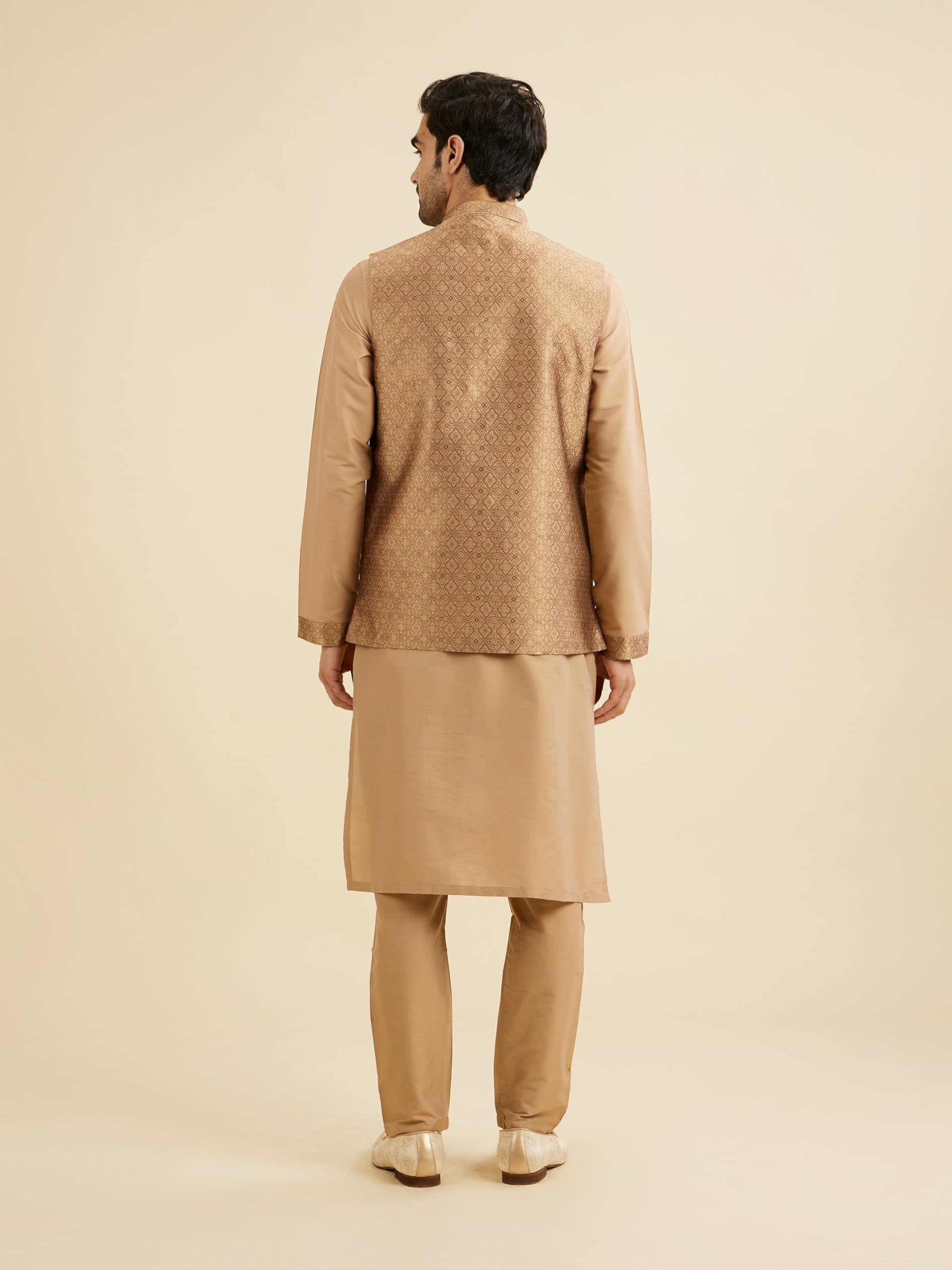 - Design: Experience the rich textures in our regal fawn Kurta Jacket Set, complete with kurta, pyjama, jacket, brooch, and pocket square. Crafted in upscale brocade and smooth viscose, it radiates sophistication and elegance. Ideal for weddings and celebratory occasions.
