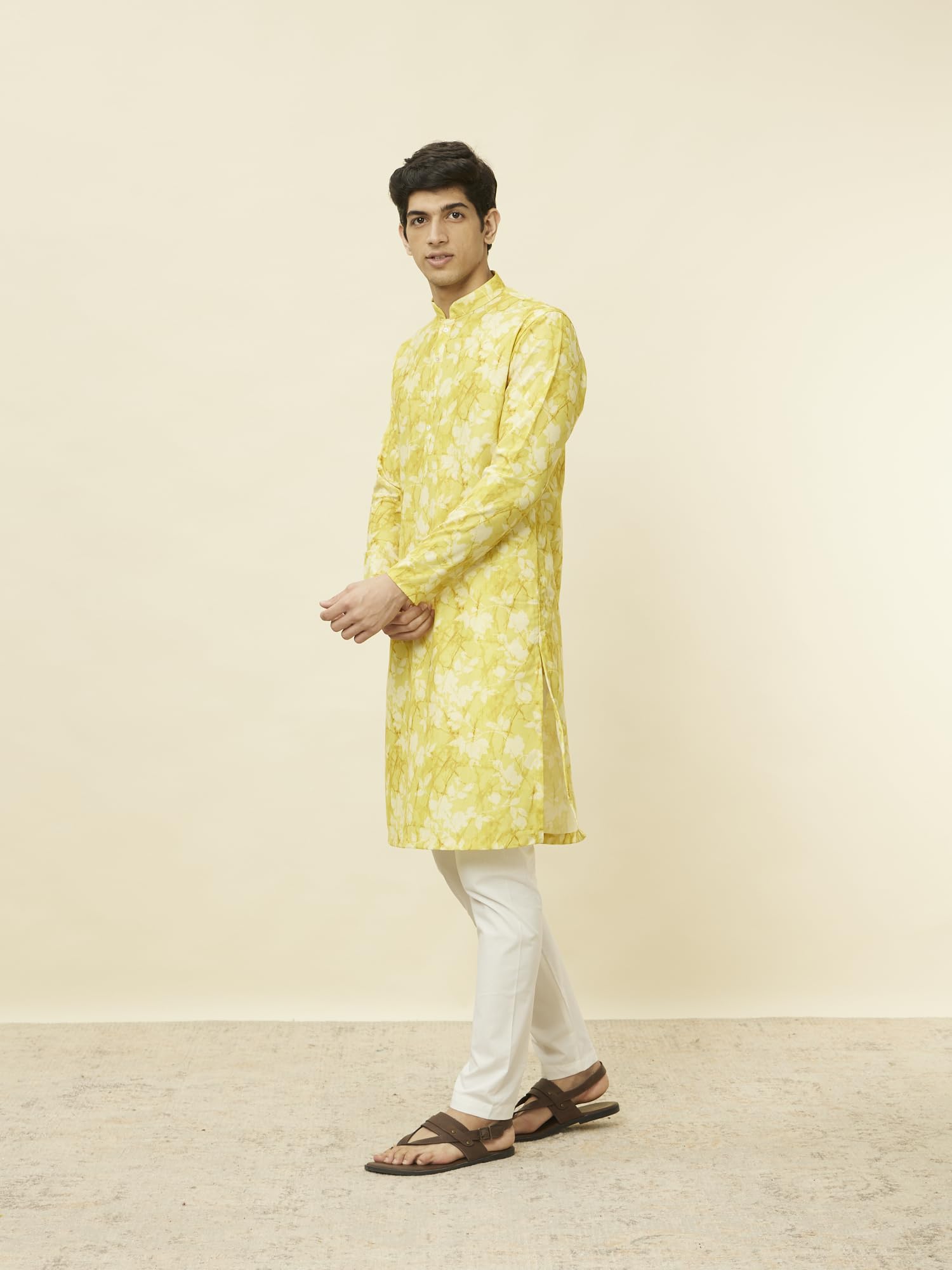 - Design:-Adorned with vibrant floral prints and a bandhgala neckline, this corn yellow kurta is a celebration of nature's palette. Wooden flat buttons add a rustic touch. Style this with a white churidar and brown sandals for a cheerful and sophisticated ensemble.
