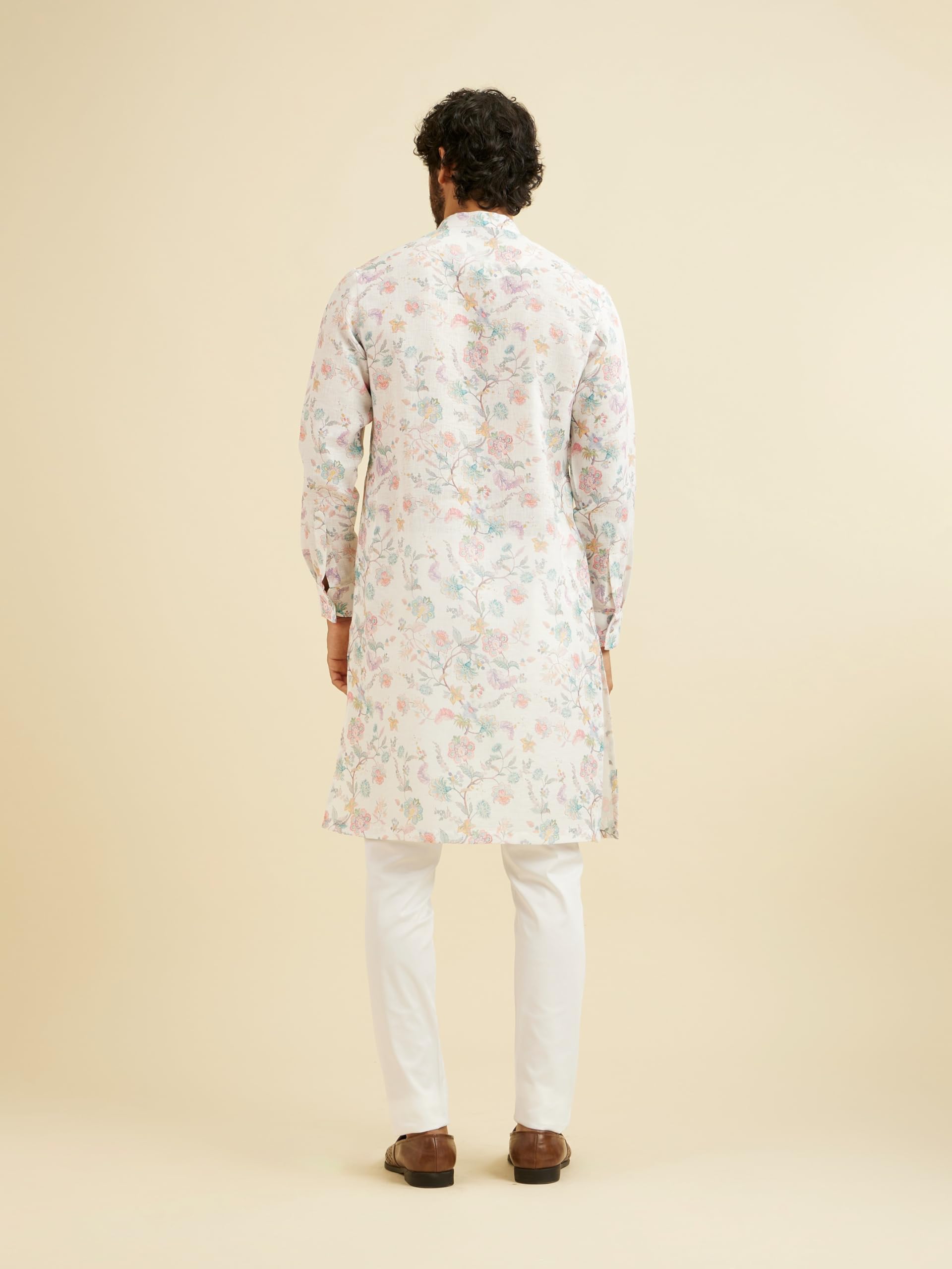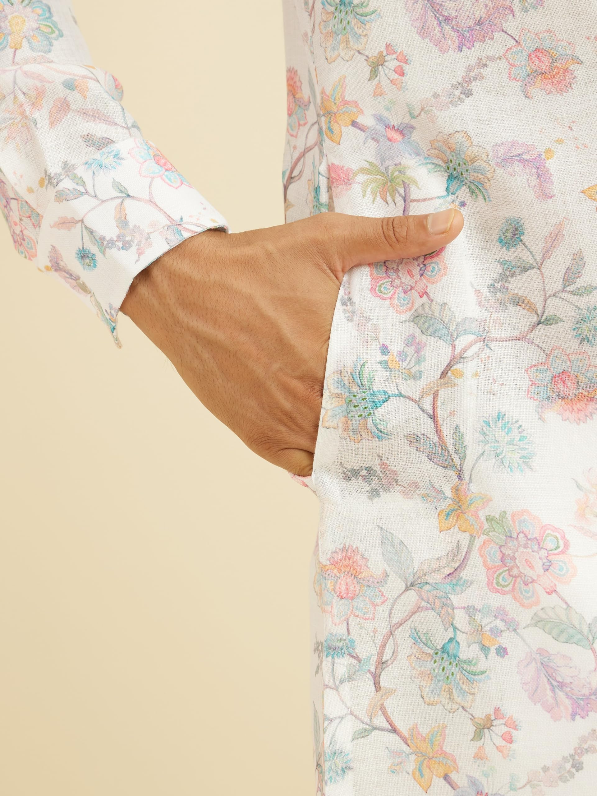 Manyavar Men's Cotton Blend Floral Print Long Kurta (White,L)