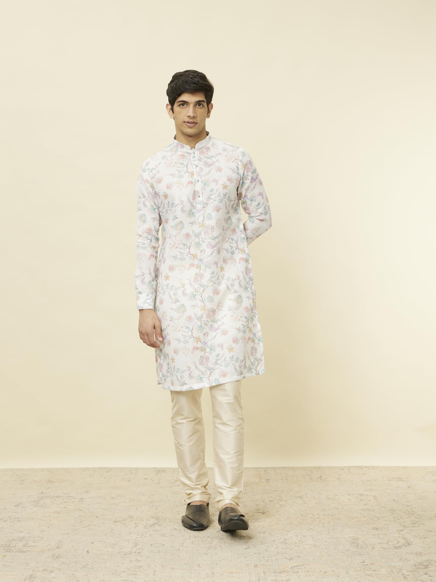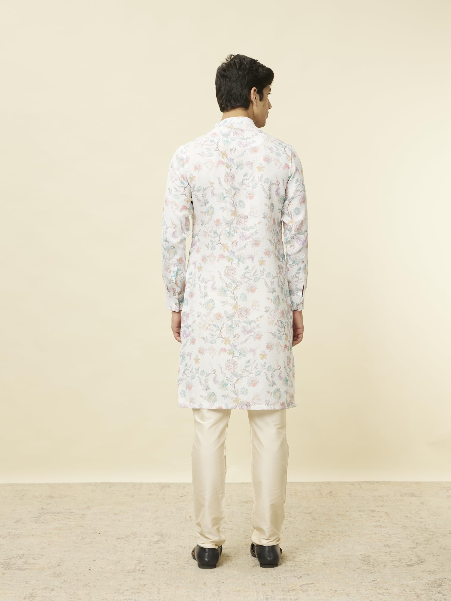 - Design:-Featuring a bandhgala and flat buttons, this delicate white kurta is adorned with multi-hued bel buti and floral prints. A perfect blend of elegance and tradition, style it with a matching pajama and mojaris for a serene and sophisticated ensemble.