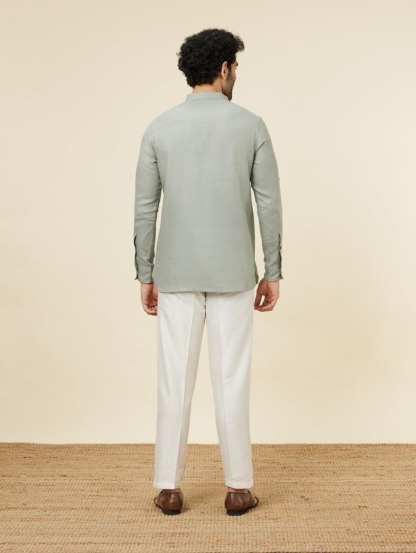 Manyavar Mens Pista Green Linen Short Kurta