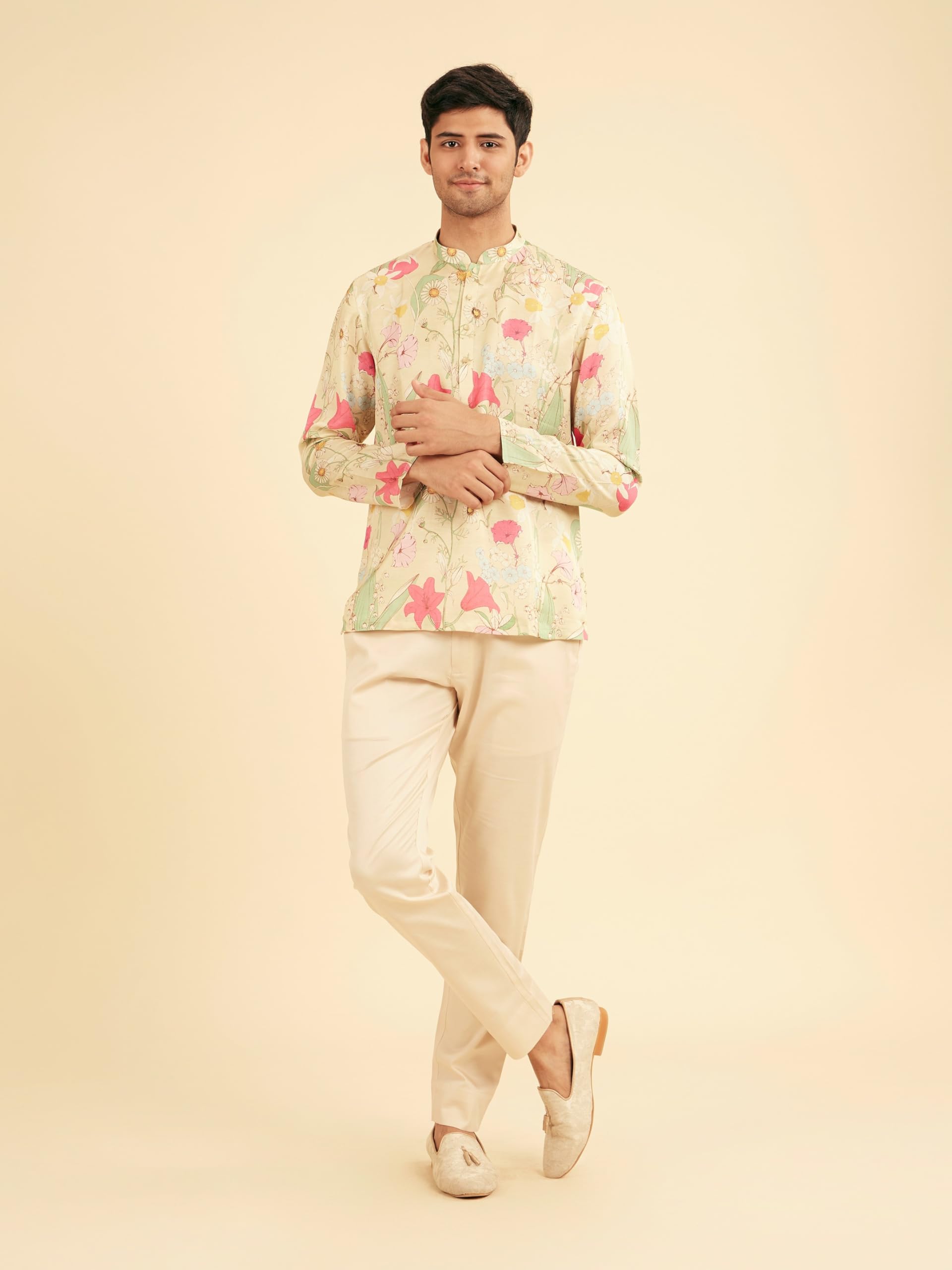 Manyavar Men's Satin Spring Floral Printed Short Kurta (Pista Green,M)