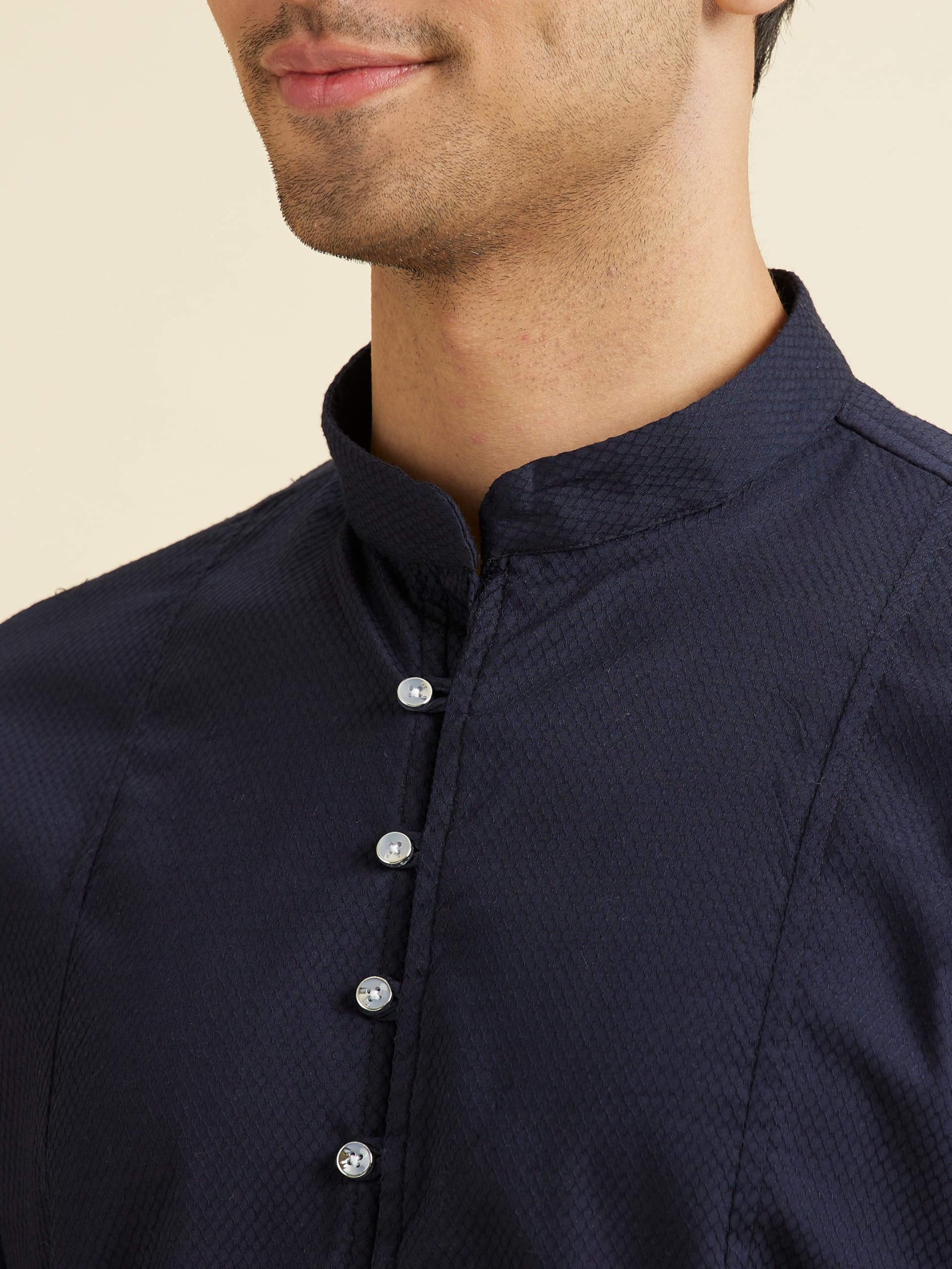 Manyavar Men's Viscose Blend Structured Short Kurta(Dark Blue,XXL)